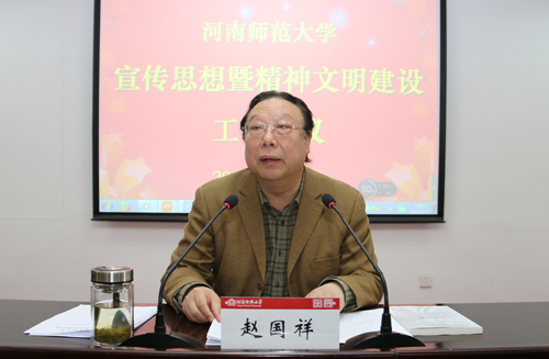 赵国祥指出,做好学校2018年宣传思想和精神文明建设工作,一要提高站位,深刻认识新时代高校宣传思想工作新要求。要深刻认识到党的十九大对学校宣传思想工作提出了新的更高要求;深刻认识到意识形态领域的复杂形势对学校宣传思想工作提出了新的更高要求;深刻认识到学校事业发展对宣传思想工作提出了新的更高要求。二要深耕细作,不断创造学校宣传思想工作新作为。要筑牢信念之魂,把学习研究宣传习近平新时代中国特色社会主义思想贯穿始终。抓学习,做到求深悟透;抓宣讲,做到人尽皆知;抓研究,做到明理明道。要夯实安全之基,不断加强和改进学校意识形态工作。要切实担负起意识形态工作的政治责任和领导责任,层层传导压力,级级夯实责任。要打造品牌之作,不断加强和改进学校思想政治工作。坚持问题导向,坚持改革创新,坚持打通最后一公里。要唱响奋进之歌,不断加强和改进学校新闻舆论工作。打好主动仗,引导好舆情。要续写辉煌之篇,不断加强和改进学校精神文明建设。对标对表,精准发力,落到实处,突出亮点,大处着眼,小处着手。要打好攻坚之战,不断加强和改进校园文化建设。注重以文化人、打造“一院一品”。三要增强本领,充分展现宣传思想工作队伍新形象。以政治家的标准要求自己,善于从政治上观察和分析问题,提高对敏感舆情和苗头性问题的发现力、研判力和处置力,占领网上舆论阵地,牢牢掌握意识形态的主导权和话语权;以专家的标准提升自己,自觉加强学习,掌握好“看家本领”,不断熟悉新领域、开拓新视野,成为全媒型、专家型人才;以实干家的标准锤炼自己,以踏石留印、抓铁有痕的精神保证各项任务落到实处,收到实效。