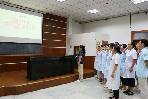 最后,副院长谢小冷带领大家进行了宣誓。全体医师举起右拳庄严宣誓:“我志愿献身人类的健康事业,自觉维护医学的庄严和神圣,敬佑生命,平等仁爱,患者至上,真诚守信……”宣誓词字字铿锵,句句有力,宣誓声在会场久久回荡。