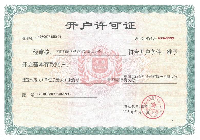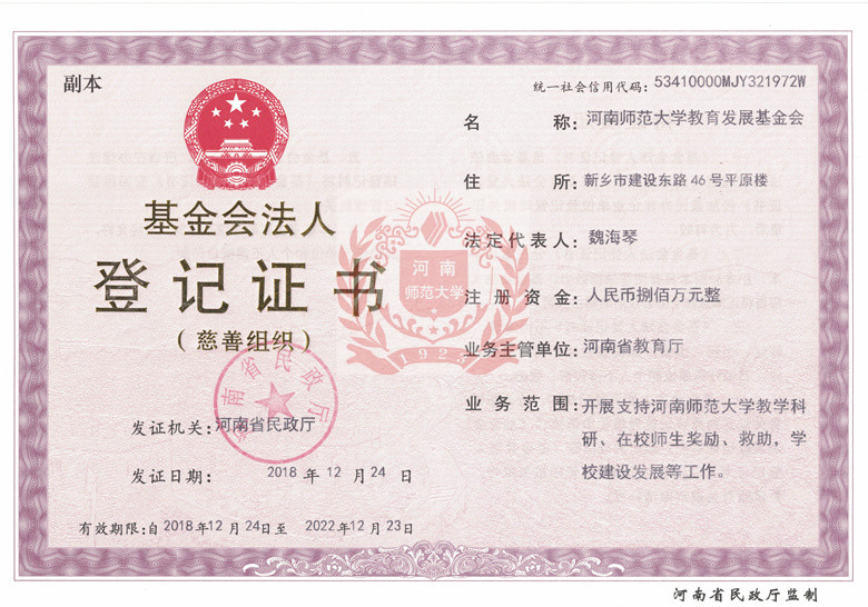 近日,河南师范大学教育发展基金会获准正式成立。在前期充分调研的基础上,学校启动基金会注册工作。2018年9月13日,学校召开了基金会第一届理事会第一次会议。经河南省教育厅同意、河南省民政厅批准,先后完成了申请、核准、注资、验资、审核、报批等程序。2018年12月24日,河南师范大学教育发展基金会获得了河南省民政厅颁发的《准予行政许可决定书》(豫民许准字〔2018〕113号),并取得了法人登记证书。
