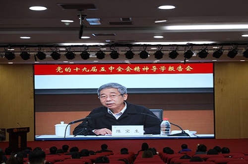 宣讲报告会上,国家教育部党组书记、部长陈宝生阐述了党的十九届五中全会召开的重大意义,介绍了《中共中央关于制定国民经济和社会发展第十四个五年规划和二〇三五年远景目标的建议》的起草过程和组成部分。他指出,这次全会是我国在全面建成小康社会胜利在望、全面建设社会主义现代化国家新征程即将开启的重要历史时刻召开的一次十分重要的会议,具有全局性、历史性意义。结合教育事业发展实际,围绕“十四五”时期战略机遇,陈宝生从“新形势、新阶段、新理念、新格局、新目标、新要求”六个方面,详尽解读了《中共中央关于制定国民经济和社会发展第十四个五年规划和二〇三五年远景目标的建议》的核心要义。