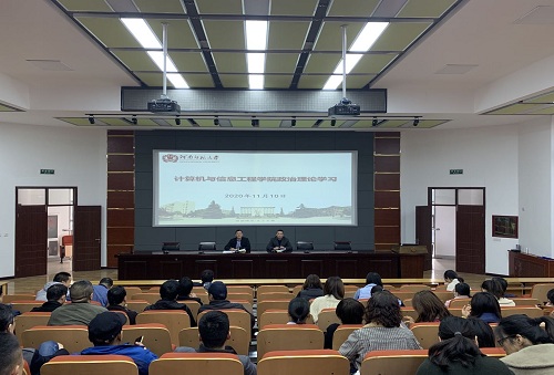 11月10日下午,计算机与信息工程学院在计科楼217报告厅组织全体教职工专题学习党的十九届五中全会精神,学院负责人及全体教职工参加。学习会由学院党委书记梁作振主持。