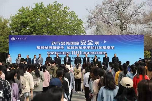 仪式上,学生代表赵莹宣读了河南师范大学《全民国家安全教育日倡议书》,校团委副书记唐新带领师生代表宣誓,与会人员参观全民国家安全教育宣传展板并领取了全民国家安全教育宣传资料。