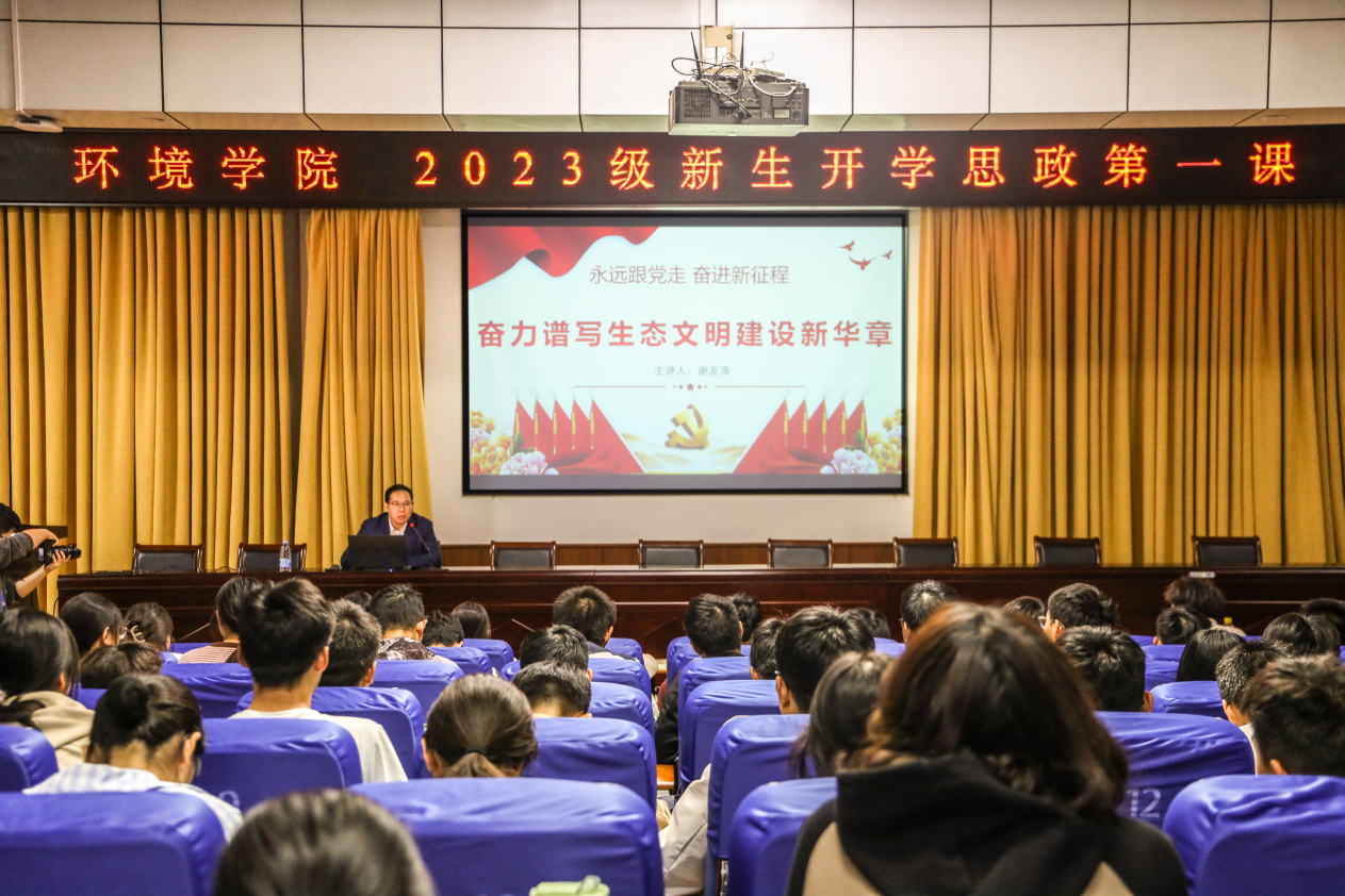 为深入学习贯彻习近平新时代中国特色社会主义思想和党的二十大精神,提高2023级新生对习近平生态文明思想的认识。10月11日,环境学院在党校教室开展2023级新生开学思政第一课活动,本次活动由环境学院党委书记谢友海主讲,2023级辅导员任洁主持,全体2023级本科生参加。