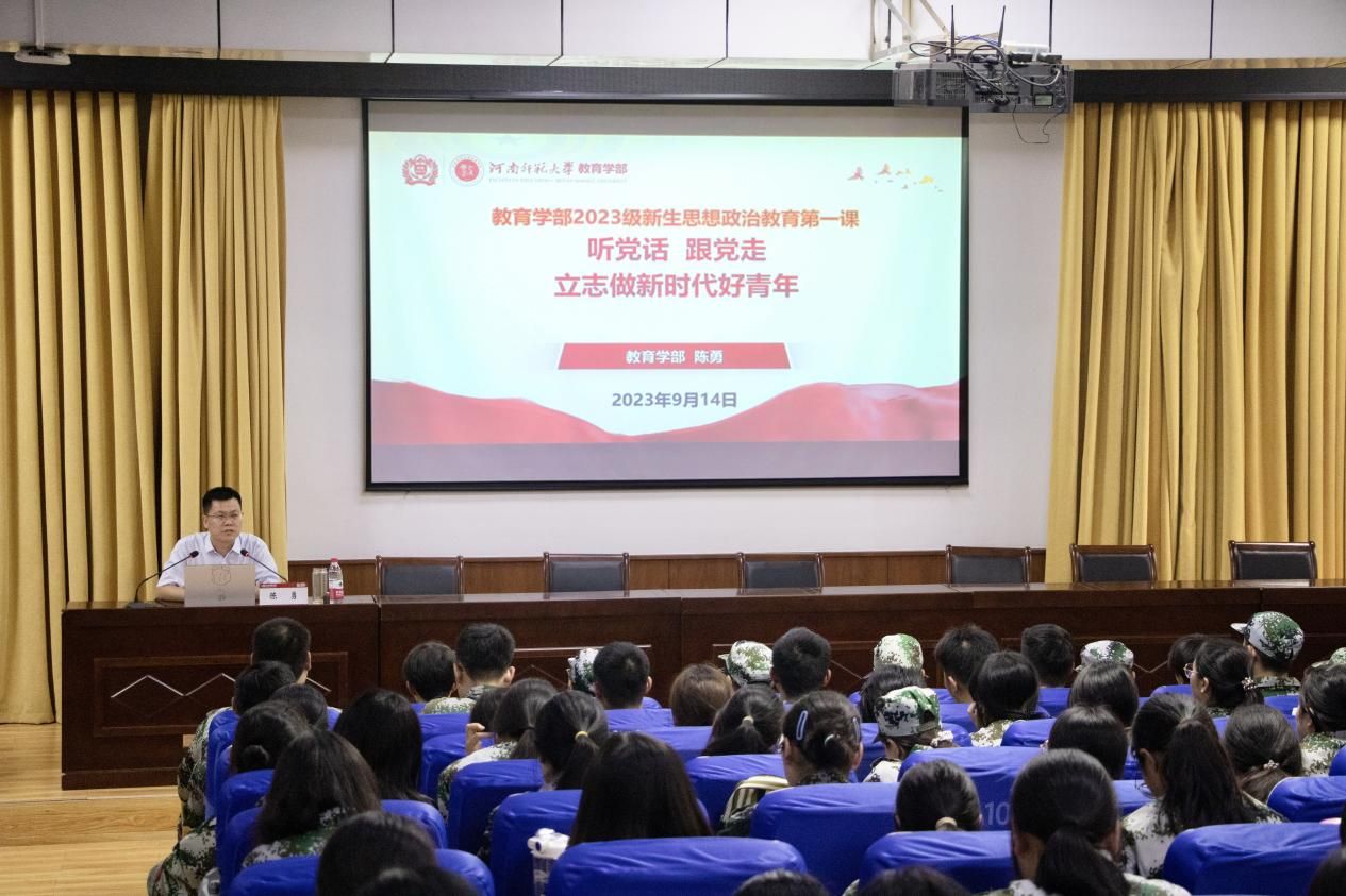为坚定新生理想信念,引导新生扣好“人生第一粒扣子”,9月14日上午,教育学部在新554教学楼党校教室为2023级新生开展思政第一课。教育学部党委书记陈勇担任主讲人。