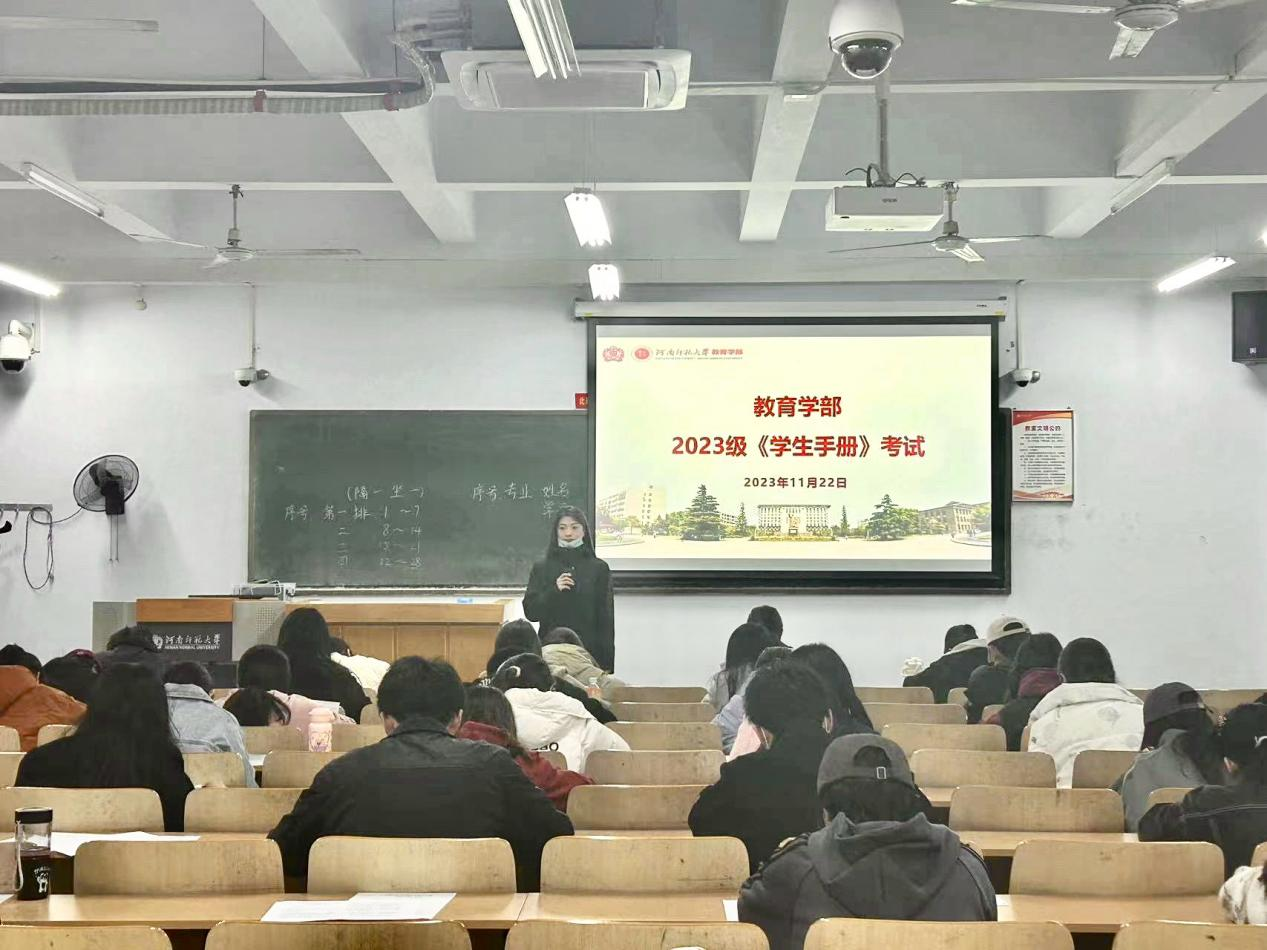 为帮助2023级新生深入了解学校规章制度,帮助新生养成良好行为规范,教育学部于11月22日在启智楼107教室组织2023级新生进行《学生手册》考试。