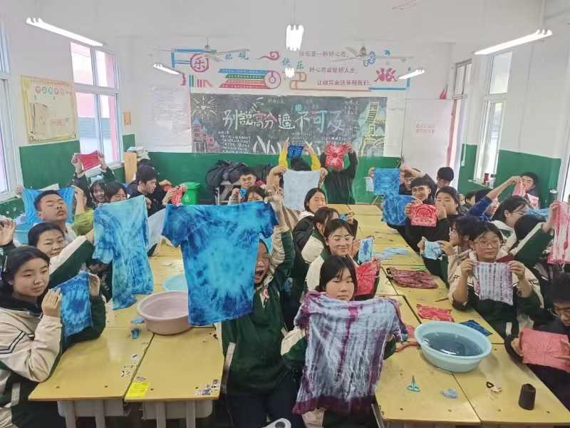 活动首先由中学美术教师、美术学院2023届校友李玉洁详细介绍扎染的历史渊源、工艺特征、手法流程、起源与传承,让同学们感受中国传统扎染艺术的魅力。接着,“美润童心”团队志愿者们在现场示范了“浸湿”“捆扎”“染色”等扎染流程。同学们戴上手套,通过纱、线、绳等工具,对织物进行扎、缝、缚、缀、夹等多种形式组合后染色。根据志愿者讲解,加上每个孩子自己独特的构思,一个个独特的扎染工艺品在孩子们的手中应运而生。孩子们之间互相讨论、介绍自己的作品,分享着扎染带来的愉悦感受并合影留念,提升了同学们自豪感和成就感。活动受到当地师生热烈称赞,让孩子们领略到了扎染及美育文化的魅力。