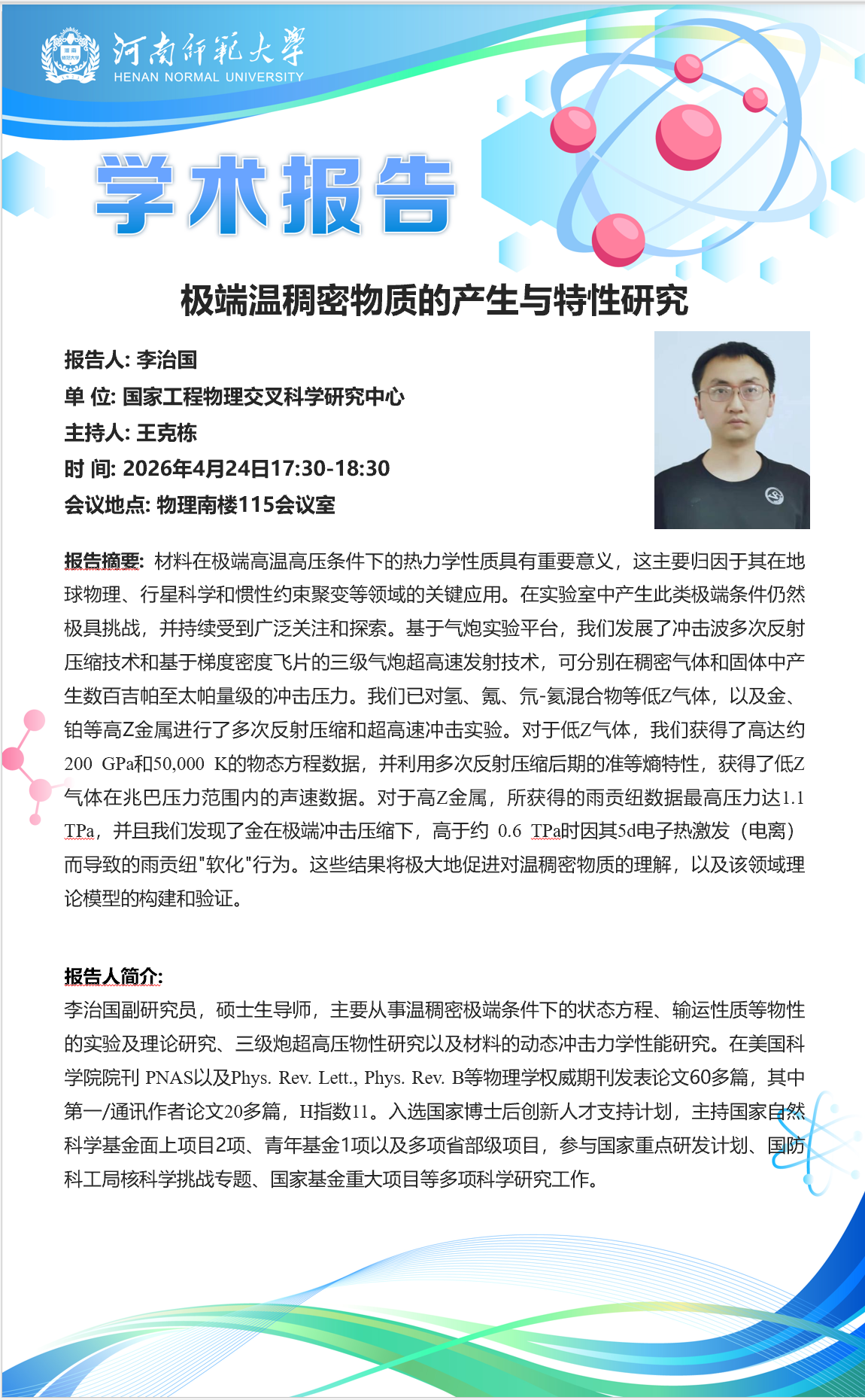 国家工程物理交叉科学研究中心李治国副研究员将应邀做客“八角楼”讲坛