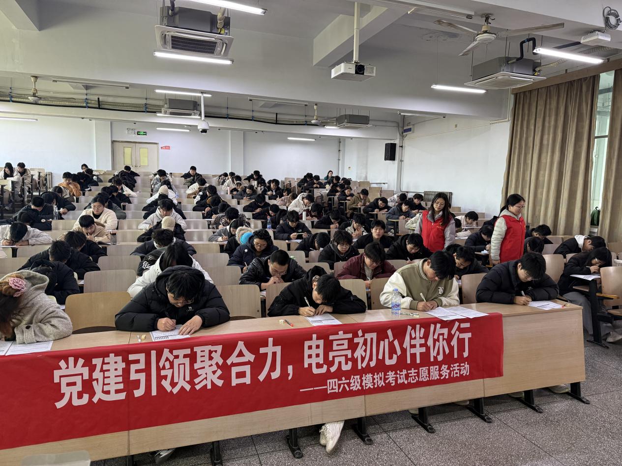为切实解决2024级学生英语四六级备考需求,充分发挥党建引领下志愿服务的实践育人作用,2025年12月4日,电亮初心党支部开展2024级学生英语四六级模拟考试志愿服务主题党日活动,以实际行动践行“党建引领聚合力,电亮初心伴你行”的服务理念,支部党员志愿者与数百名学生共同参与此次活动。