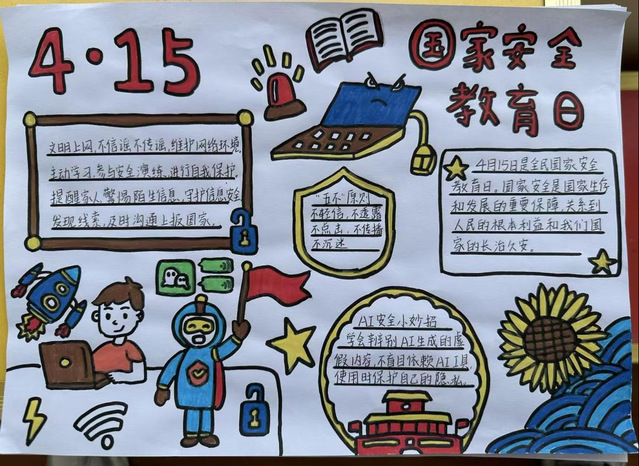 活动现场,团队成员李颖通过讲述“AI安全探险记”小故事,结合青少年熟悉的生活场景与案例,用鲜活案例展现人工智能在学习、生活中的广泛应用,生动诠释了AI如何变革学习方式、拓宽认知视野,让同学们在熟悉的情境中沉浸式感受科技魅力。他们结合真实案例,生动呈现了智能助手可能带来的信息泄露风险与虚假信息陷阱,引导孩子们学会独立思考、不盲从机器结论,同时强调不向AI透露身份证号、家庭住址等敏感隐私信息。宣讲结束后,活动进入手抄报共创环节,孩子们用画笔表达自己理解的“安全AI世界”,有的画出带锁的对话框,有的画出长着问号眼睛的机器人,这些稚拙而真诚的画面,成为国家安全教育最生动的注脚。