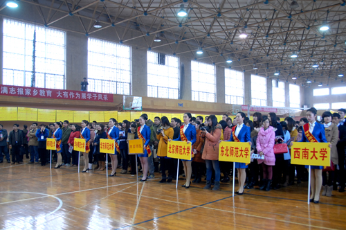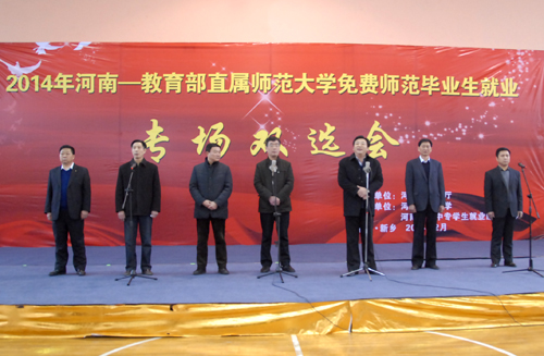 2月26日上午,由河南省教育厅主办、河南省大中专学生就业服务中心、河南师范大学承办的“2014年河南—教育部直属师范大学免费师范毕业生就业专场双选会”在我校球类馆举行。河南省教育厅师范教育处处长朱自锋、河南师范大学副校长孙先科出席双选会,省教育厅学生处调研员杨占军,省财政厅教科文处副处长张贵勇,新乡市教育局副局长刘建学,河南师范大学就业指导服务中心主任马玉栋共同参加了双选会。双选会开幕式由省教育厅师范教育处副处长杨永盛主持。