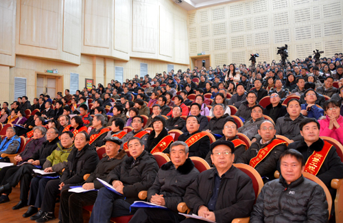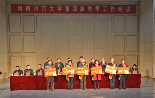 徐存拴宣读《河南师范大学关于表彰教学工作突出贡献集体和个人的决定》,校领导为获得教学工作突出贡献的集体和个人颁发奖金和奖牌。国家级教学名师、化学化工学院渠桂荣教授,文学院院长曹书文分别代表受表彰先进个人和先进集体进行发言。