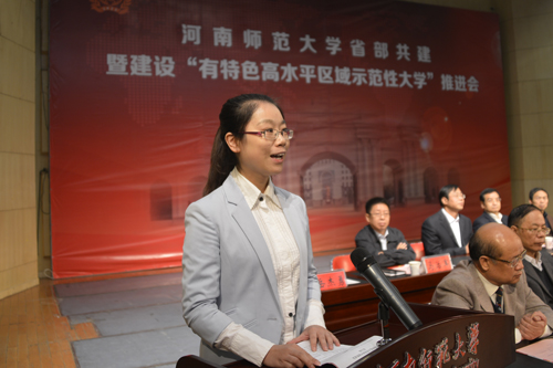 推进会上,副校长孙先科宣读了《河南省人民政府、教育部关于共建河南师范大学的意见》。校特聘教授、物理与电子工程学院常钦博士,校研究生会主席、教育与教师发展学院2014级研究生张云婷分别作为教师和学生代表发言。