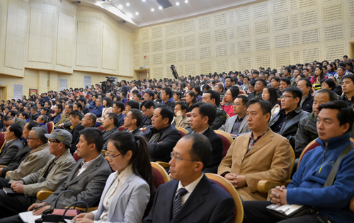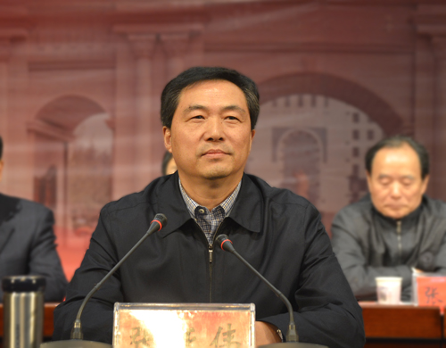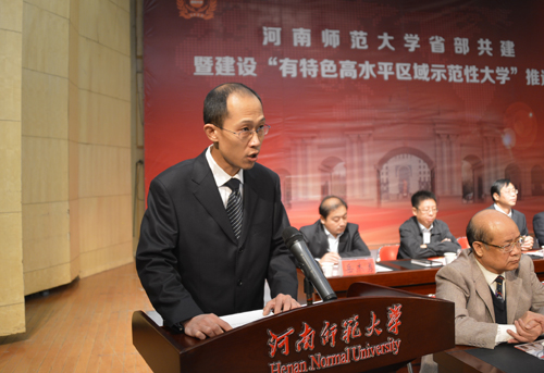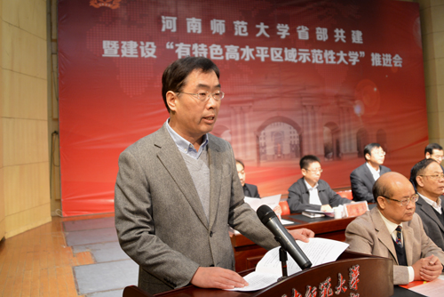 党委书记郑邦山回顾了我校建设省部共建高校的艰难历程,强调实现省部共建,离不开教育部、省政府、省高校工委、省教育厅领导对共建工作的高度关注,离不开师大光荣的历史传统和历代前辈先贤为师大打下的牢固基石,离不开广大校友的无私帮助与支持和学校全体师生的不懈努力,离不开历届领导班子以强烈的事业心和使命感为共建成功做出的突出贡献。郑邦山指出,我校实现省部共建意义重大,它实现了几代师大人的夙愿,印证了学校的办学成就,促进了河南省高等教育的发展,也给学校带来了空前机遇和广阔平台。面对国家和河南省对省部共建高校“有特色,高水平,区域示范性”的要求,学校还存在较大差距,具体表现在“有特色”彰显不够,“高水平”成绩不足,“区域示范性”发挥不够。站在新的历史起点上,师大人必须激流勇进,勇挑重担,在责任担当中谋新篇。