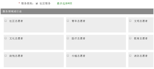 注:服务类型要在“社区服务”前的方格里打对勾,然后在下面服务领域或行业自行选择,最多选择4项。否则无法进入下一页面。