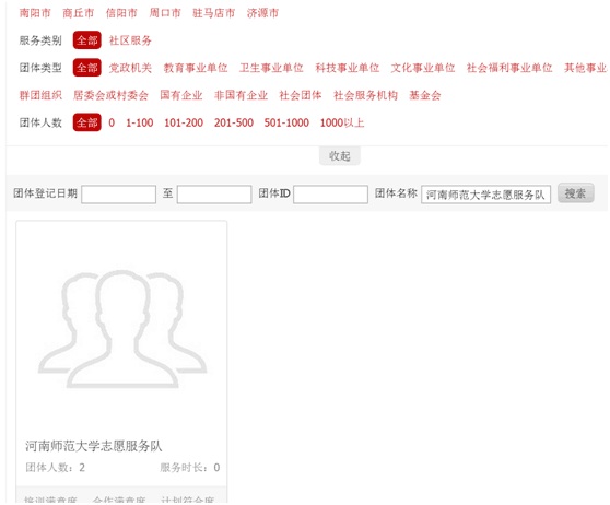 8.点击搜索,进入“河南师范大学志愿服务队”,选择“我要加入” ,如图2-8、2-9所示: