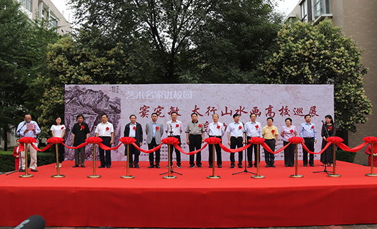 6月9日上午,由河南省教育厅主办的“艺术名家进校园——窦宪敏太行山水画高校巡展”在我校举行启动仪式和首展。中共河南省委原常委、政法委书记、省助残济贫总会主席张世军,省十二届人大常委会党组副书记、副主任蒋笃运,省教育厅副巡视员李金川,省政府原省长助理秘书长安惠元,省学校艺术教育协会会长石品,省教育界书画家协会主席谷景立,新乡市人民政府副市长李瑞霞等省市领导,党委常委、副校长刘玉芳出席启动仪式。河南省高校美术和设计学院的各位领导、省内外艺术界各位专家、美术学院百余位师生参加了活动。启动仪式由美术学院院长张建伟主持。