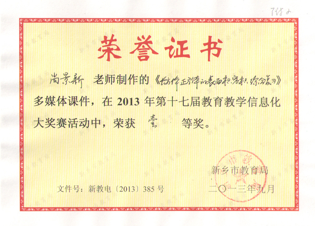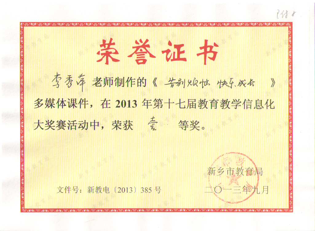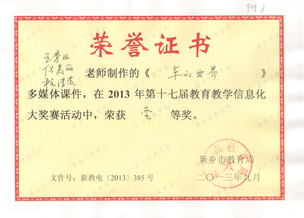 2013年9月,附小教师在2013年新乡市第十七届教育教学信息化大奖赛活动中成绩突出,尚景新老师制作的《长方体正方体的表面积容积综合复习》、王秀凤老师制作的《车的世界》、李秀萍老师制作的《告别烦恼,快乐成长》多媒体课件获一等奖。
