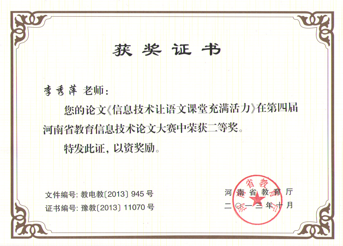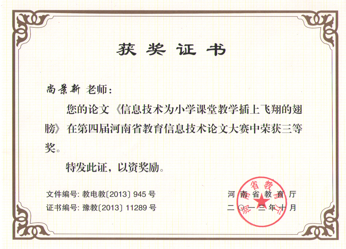 2013年10月,在第四届河南省教育信息技术论文大赛中,李秀萍老师撰写的《信息技术让语文课堂充满活力》、尚景新老师撰写的《信息技术为小学课堂教学插上飞翔的翅膀》分获二三等奖。