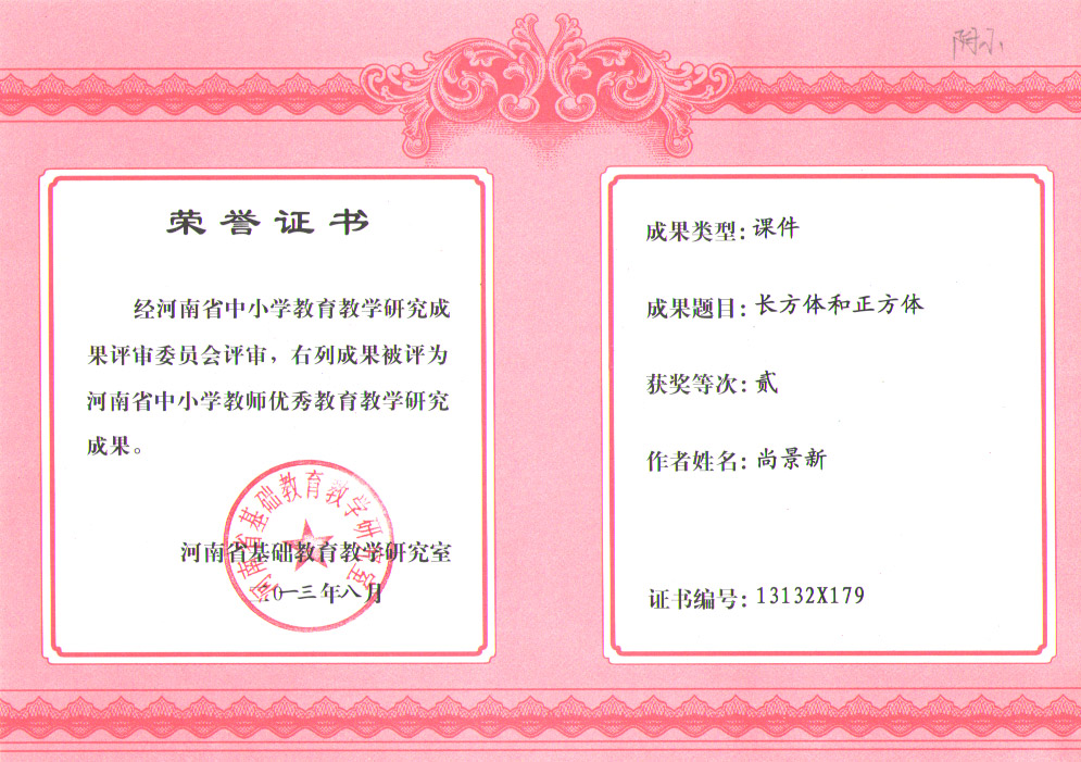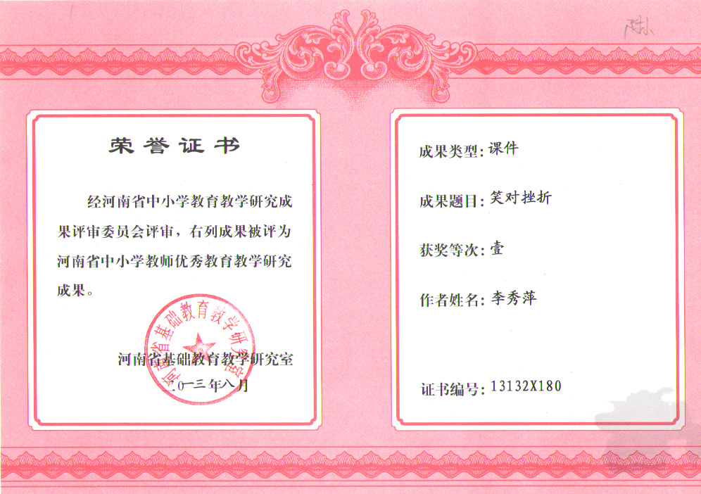 2013年8月,在河南省中小学教师优秀教育教学研究成果评比活动中,李秀萍老师制作的《笑对挫折》课件、尚景新老师制作的《长方体和正方体》课件,分别获得获一二等奖。