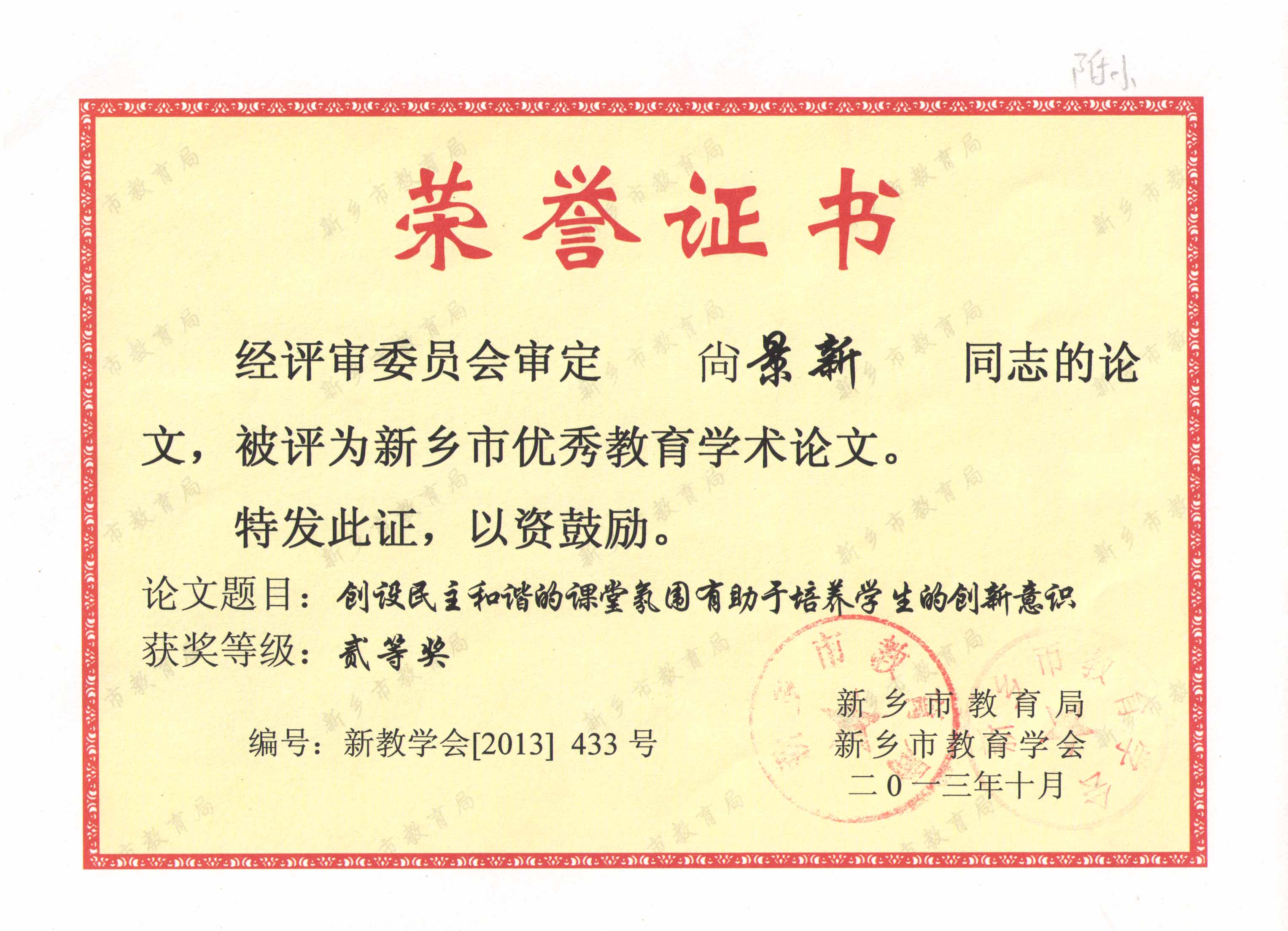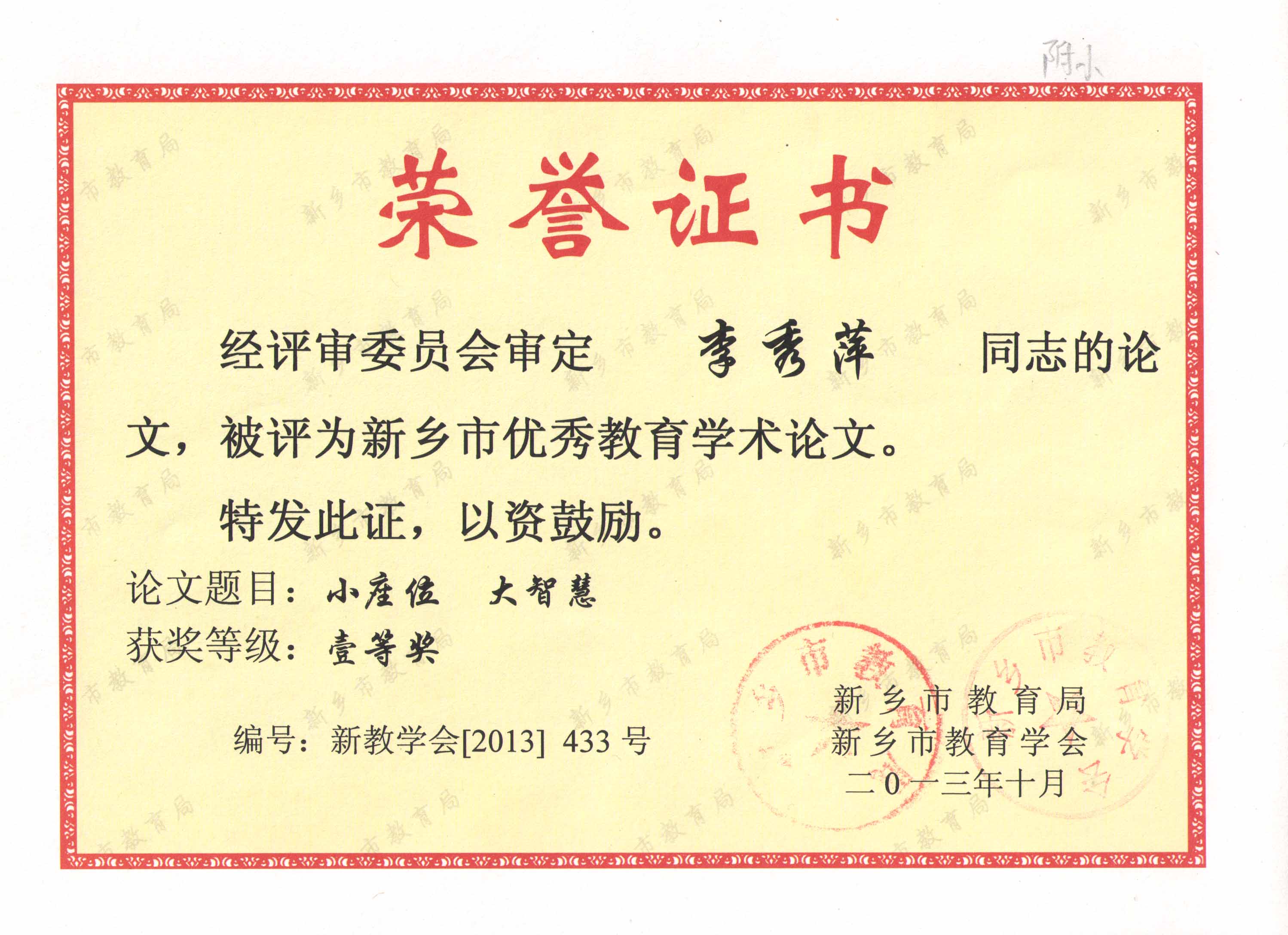月,在新乡市优秀教育学术论文评比中,户婕、李秀萍获一等奖,彭筱青、尚景新老师获二等奖。