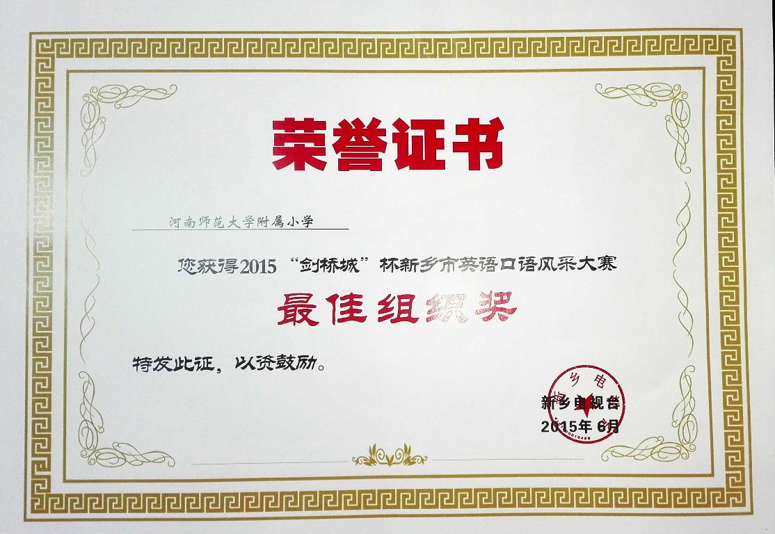 2015年“剑桥城杯”新乡市首届英语口语风采大赛,历时两个多月,由电视台主办,分为小学组、初中组、高中组及大学组5个组别,共有4300多名选手报名。附属小学学生踊跃报名,积极参加。经过海选、初赛、复赛、半决赛、决赛的层层选拔,附属小学共有20多名学生闯入半决赛,4名学生进入十强赛,3名学生最终闯入总决赛。