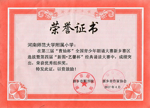 我校荣获第三届“曹灿杯”全国青少年朗读大赛新乡赛区优秀组织奖