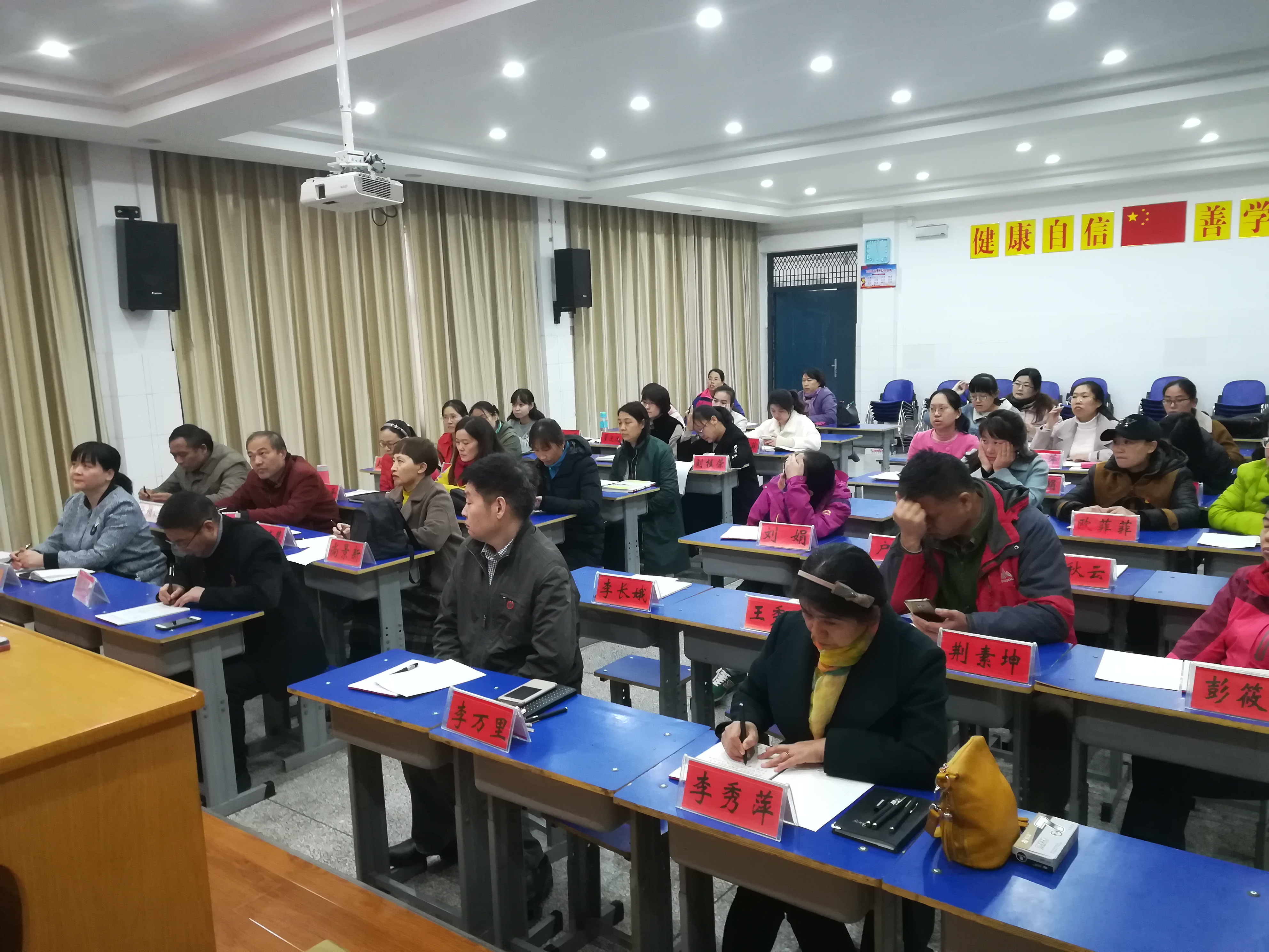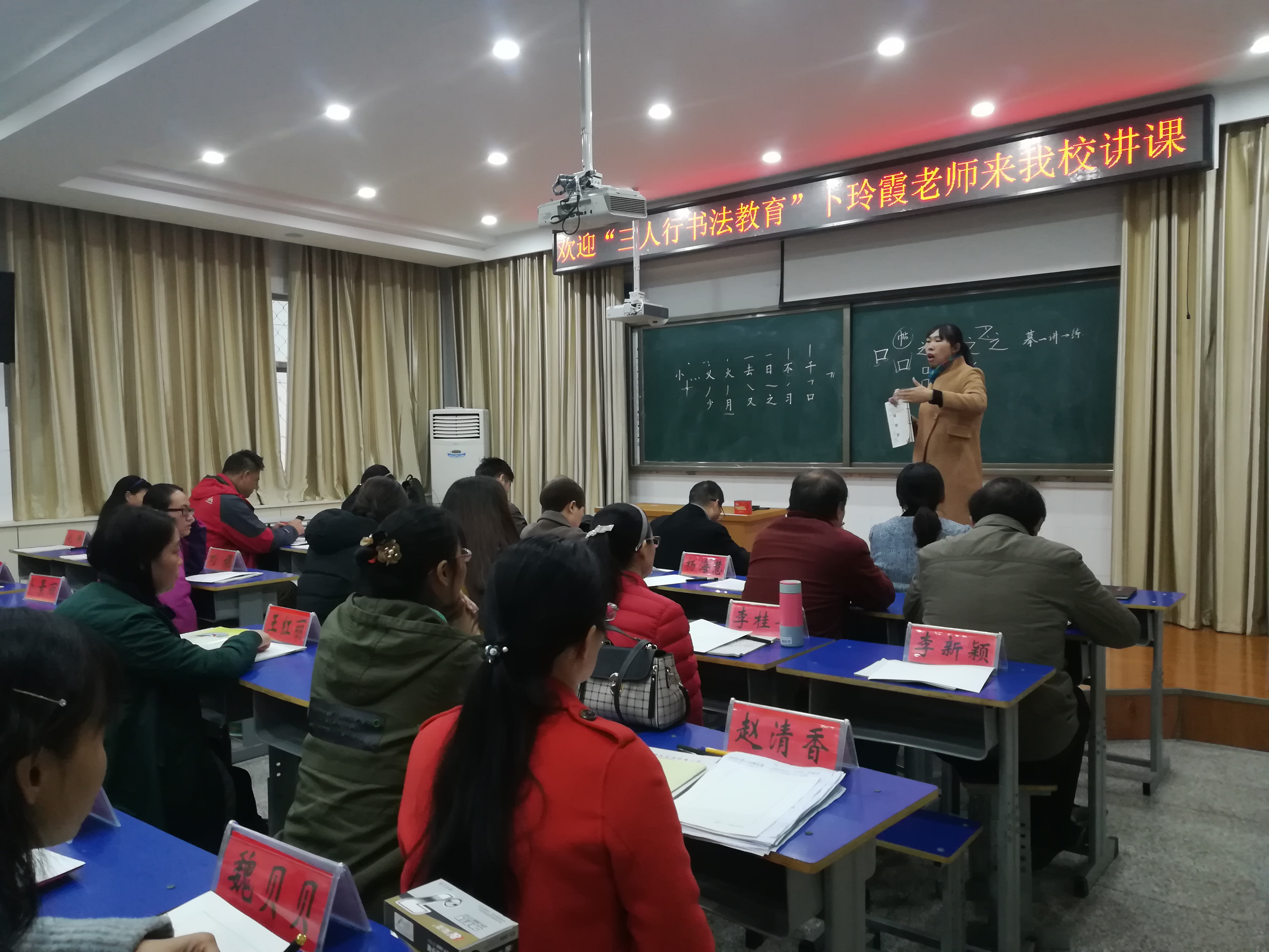 卜老师从基本笔画、间架结构、书写要领,以及如何把练字落到实处等方面进行了具体的指导。老师们听得津津有味,练得认认真真。