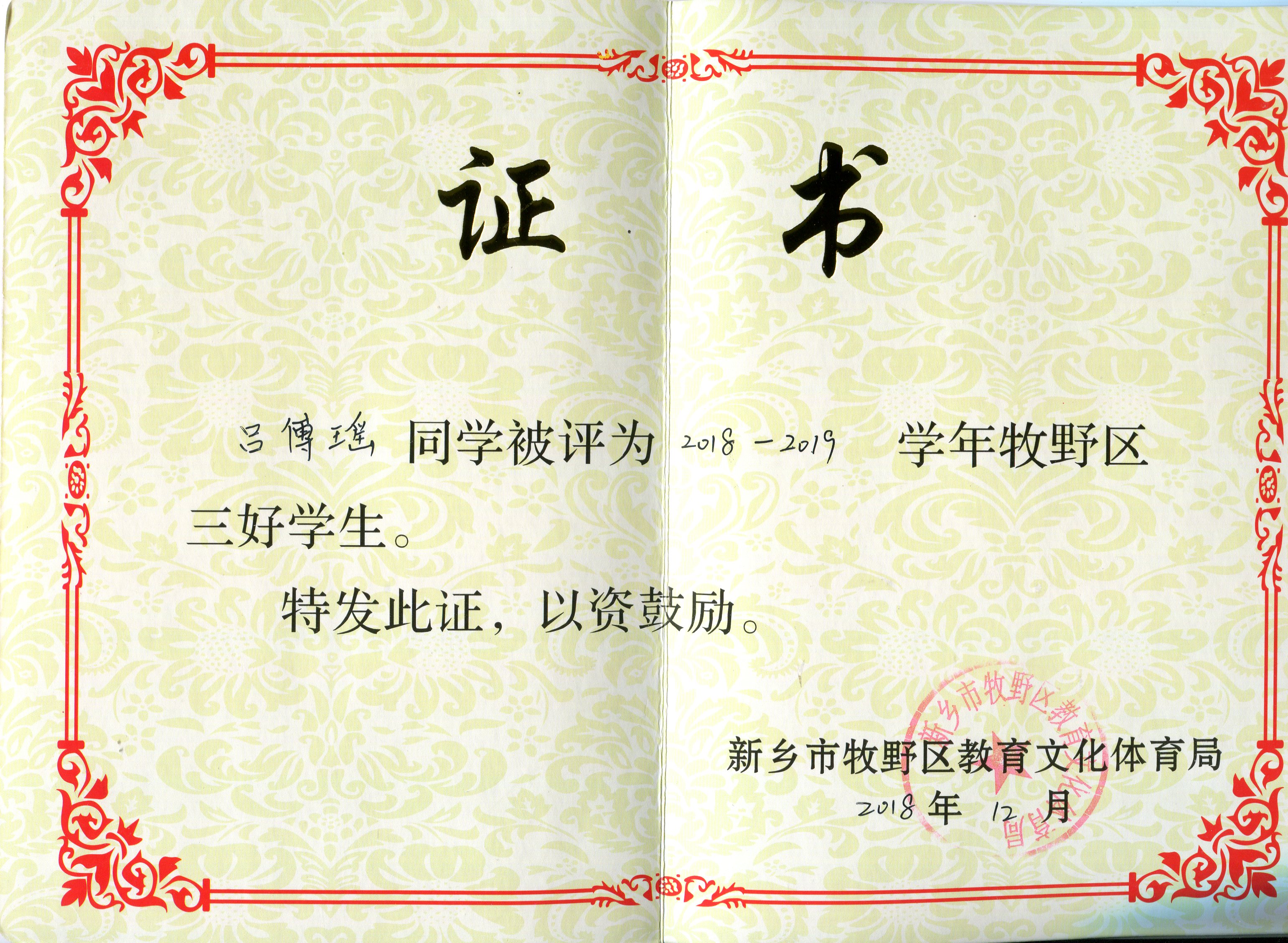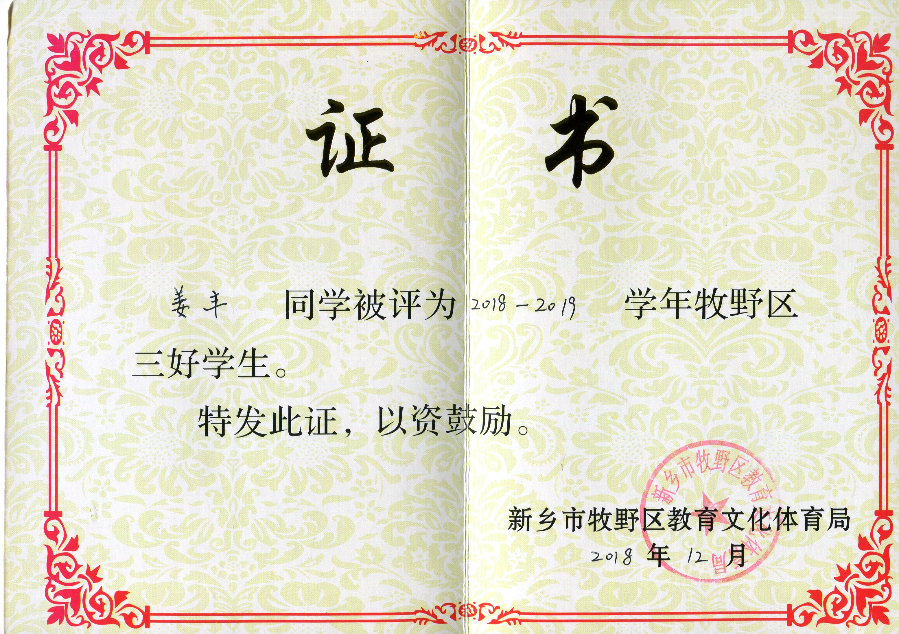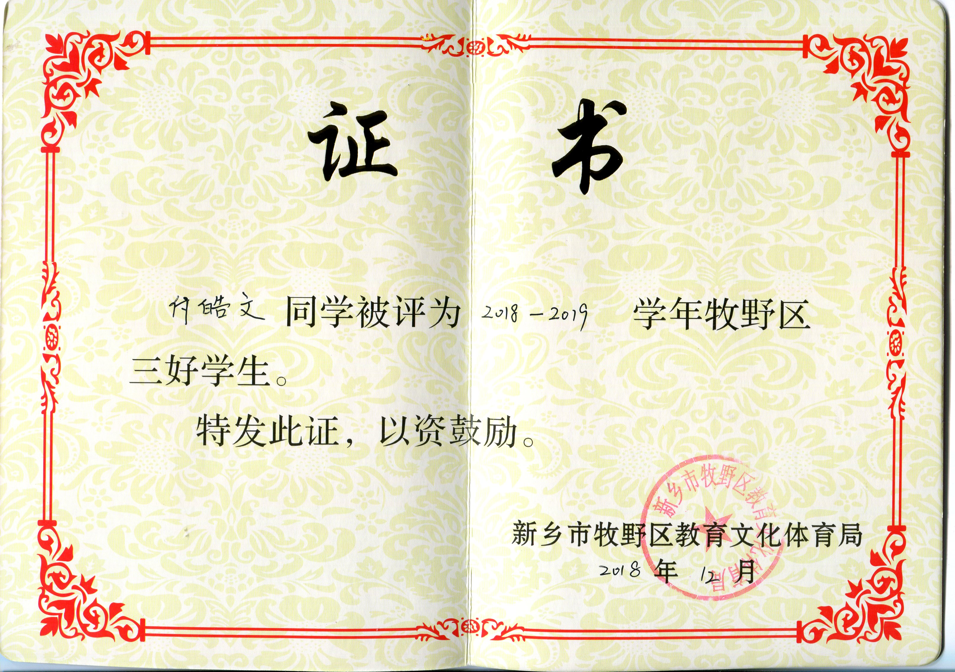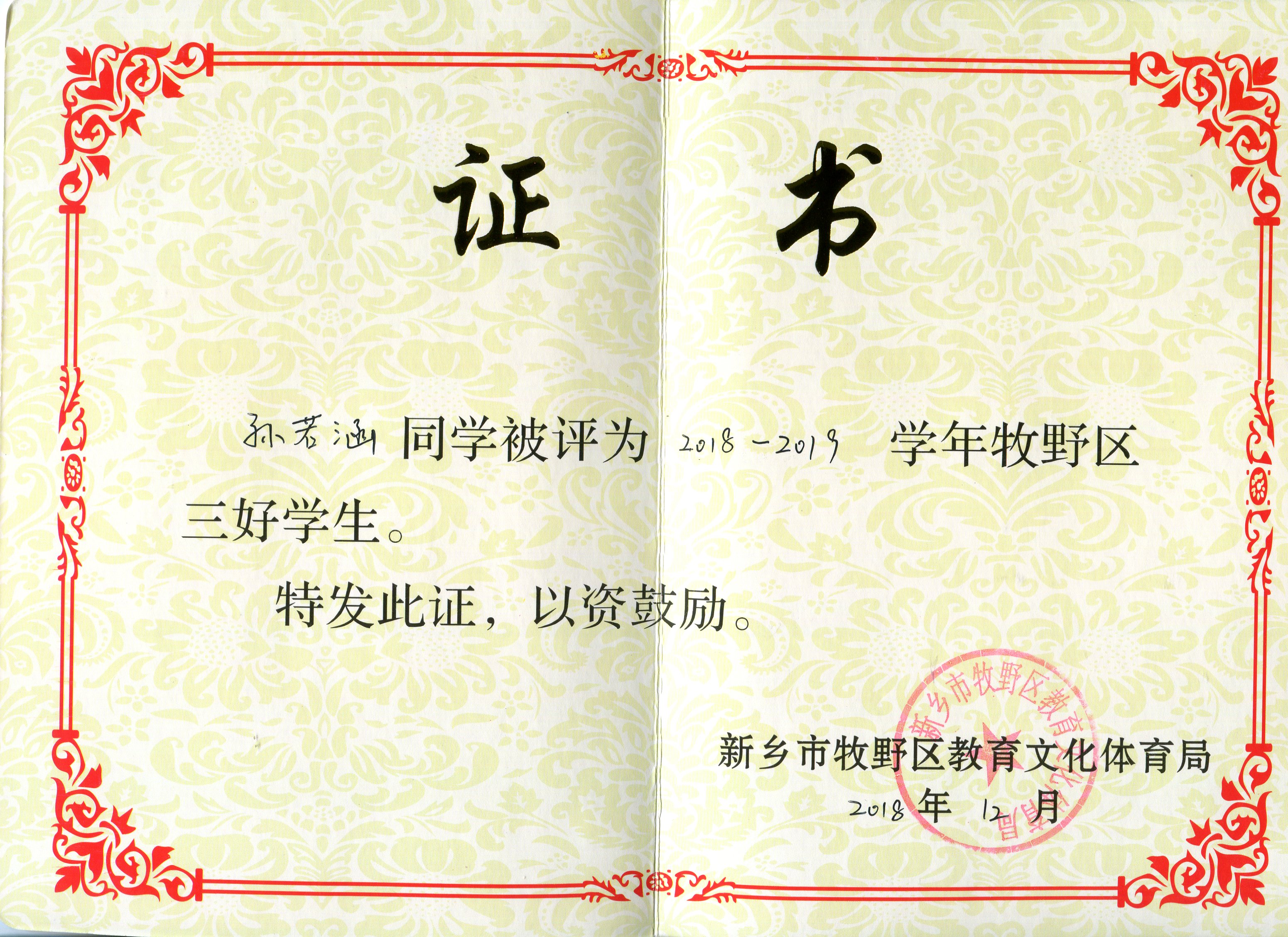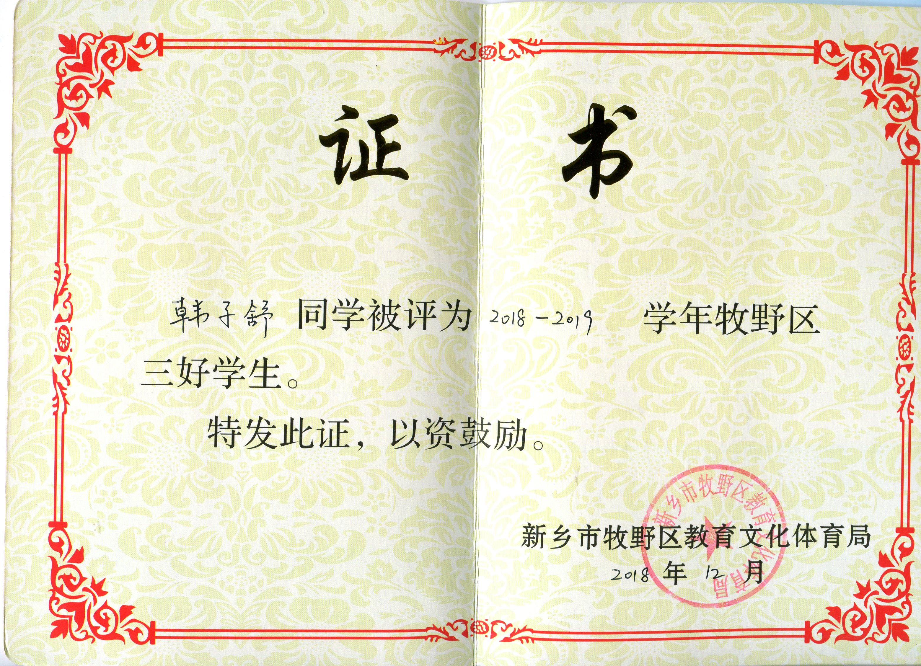 我校学生姜丰、韩子舒、吕傅瑶、孙若涵、付皓文、徐一展、赵钰辰7位同学在学校表现突出,被评为2018-2019学年牧野区三好学生。