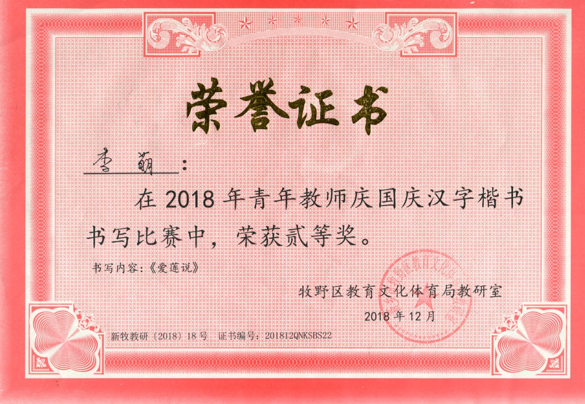 ,李萌的《爱莲说》获区青年教师庆国庆汉字楷书书写比赛二等奖。