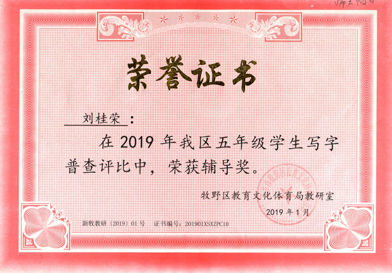 月,刘桂荣获牧野区五年级学生写字普查评比辅导奖。