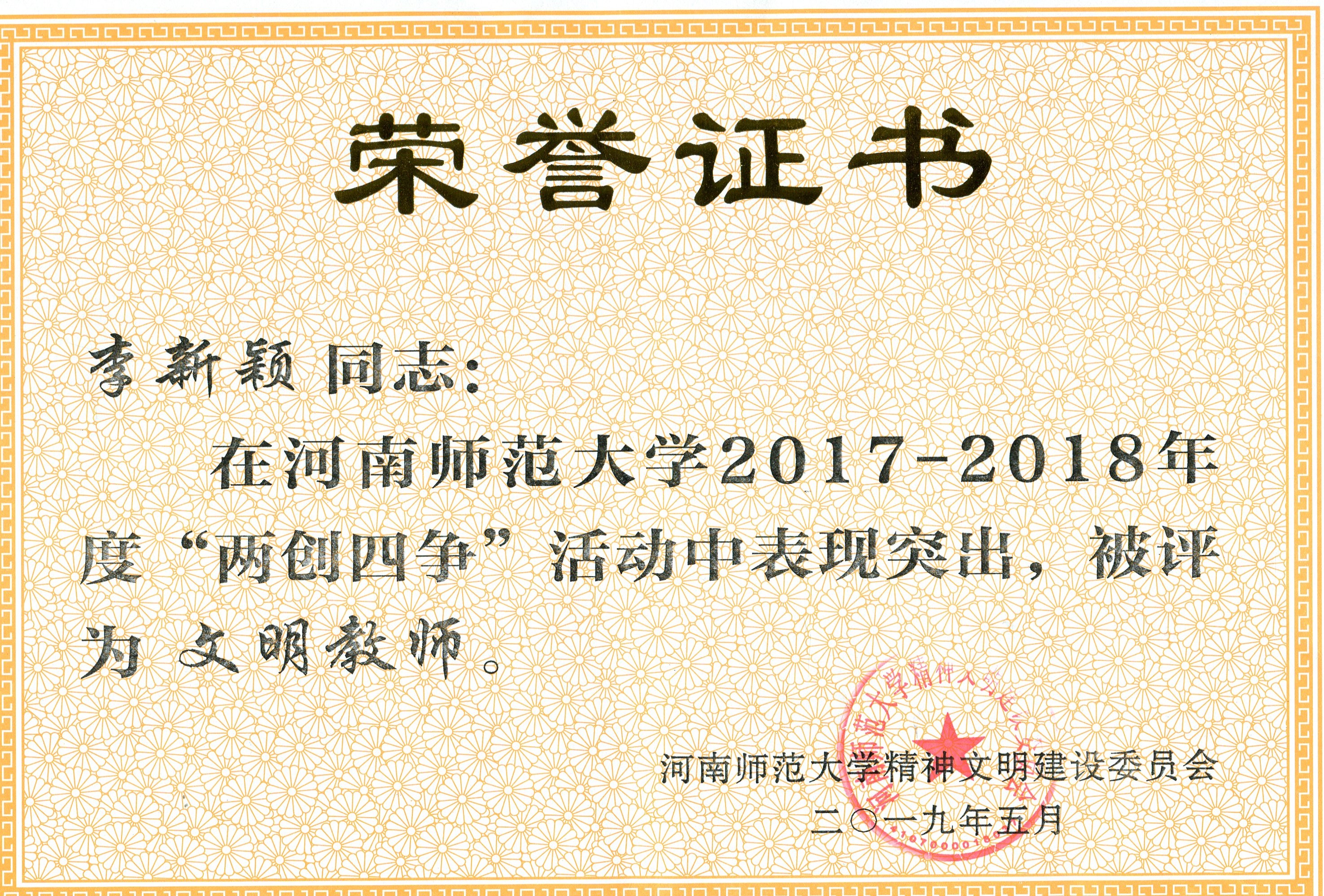 杨海慧老师深入学习习近平新时代中国特色社会主义思想和党的十九大精神,坚定“四个意识”,践行“两个维护”,政治上、思想上、行动上和党中央保持高度一致。她始终坚持以学生为本,关心爱护学生,做学生的良师益友,尊重学生个性,善于发现学生身上的闪光点,用人格魅力感召学生,用学识引导学生,用智慧启发学生,用热情温暖学生,用品行感化学生,赢得了学生的尊重和爱戴。