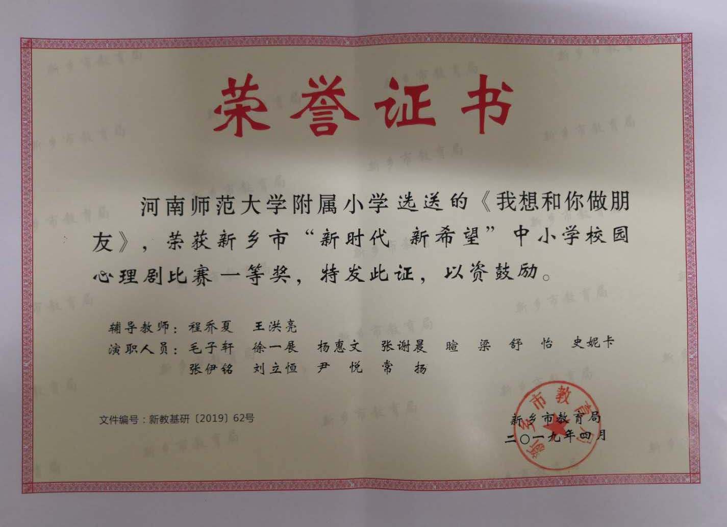 经过“附属小学心理剧社团”社团负责人常扬和指导教师程乔夏两年多的编、排,六一班选送的校园心理剧《我想和你做朋友》获得新乡市“新时代,新希望”中小学校园心理剧比赛一等奖。