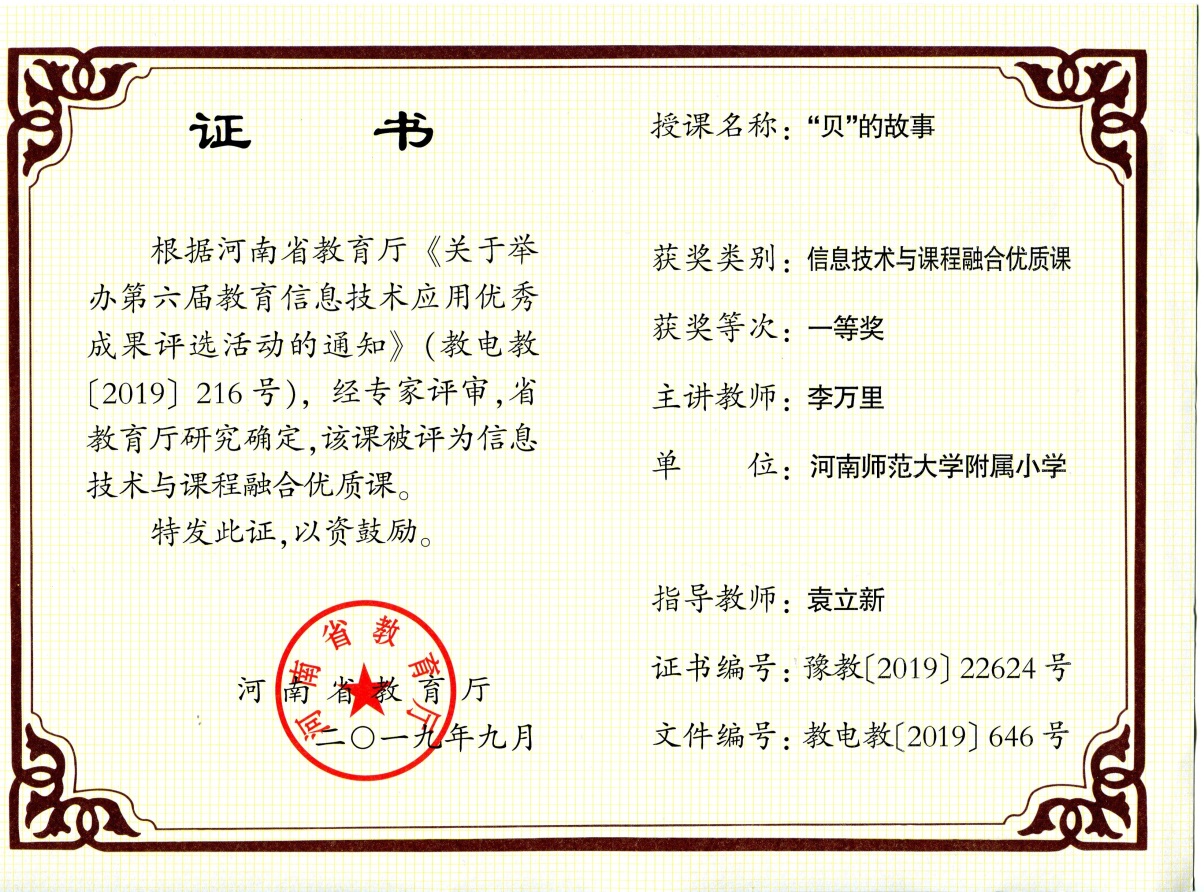 月,李万里校长执教的《“贝”的故事》获省信息技术与课程融合优质课一等奖。