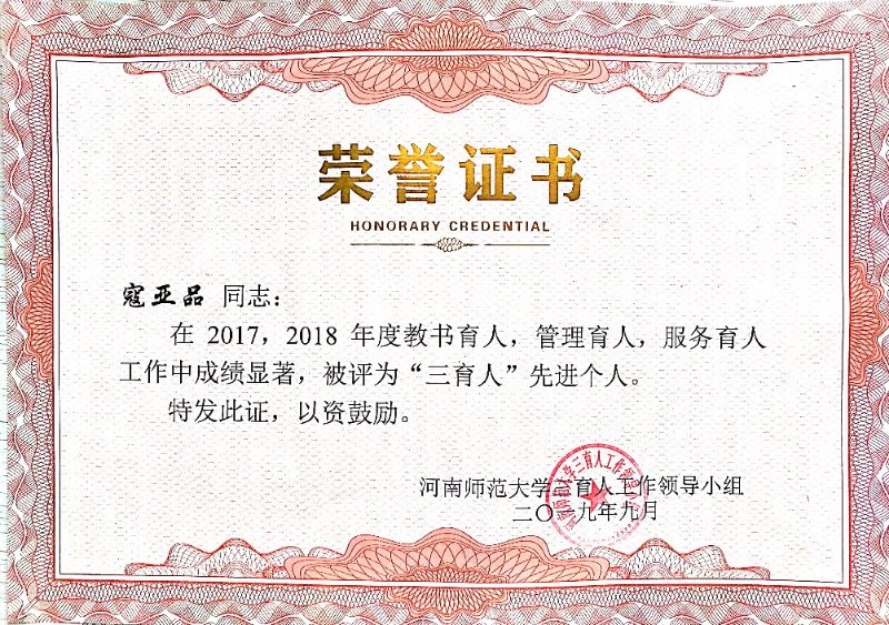 多年来,寇亚品始终坚定一个信念:立足于本职岗位,处处以大局为重,以工作为重,教书育人,服务育人,热爱教育事业,热爱学生,以学生为本,能全面贯彻党的教育方针,认真践行“教风行”。
