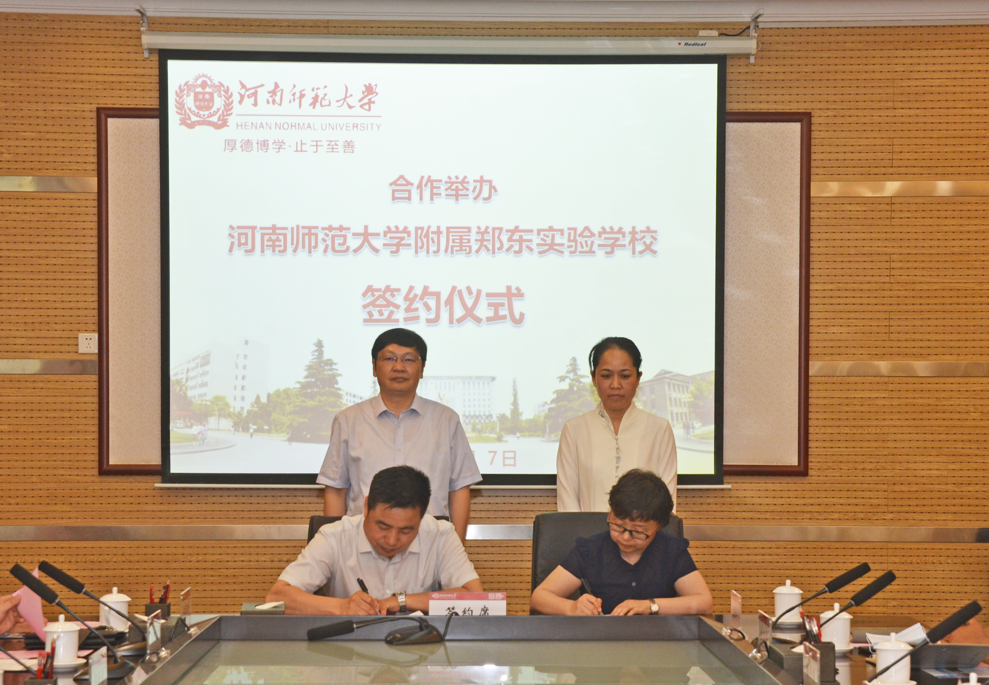 在李学志、刘亚敏等领导和嘉宾的见证下,我校基础教育集团张银付和郑州育人教育集团郭喜凤代表双方签署了合作办学协议。