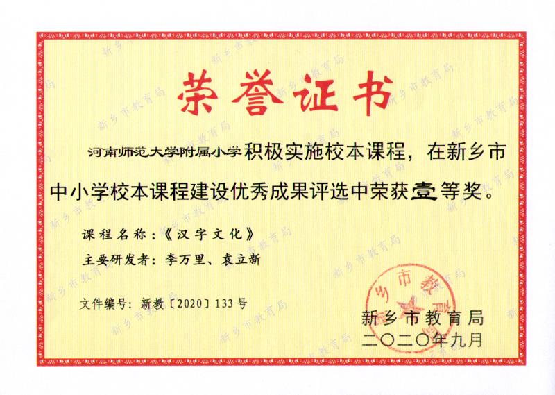 我校李万里校长主要研发的校本课程《汉字文化》,获新乡市中小学校本课程建设优秀成果一等奖。