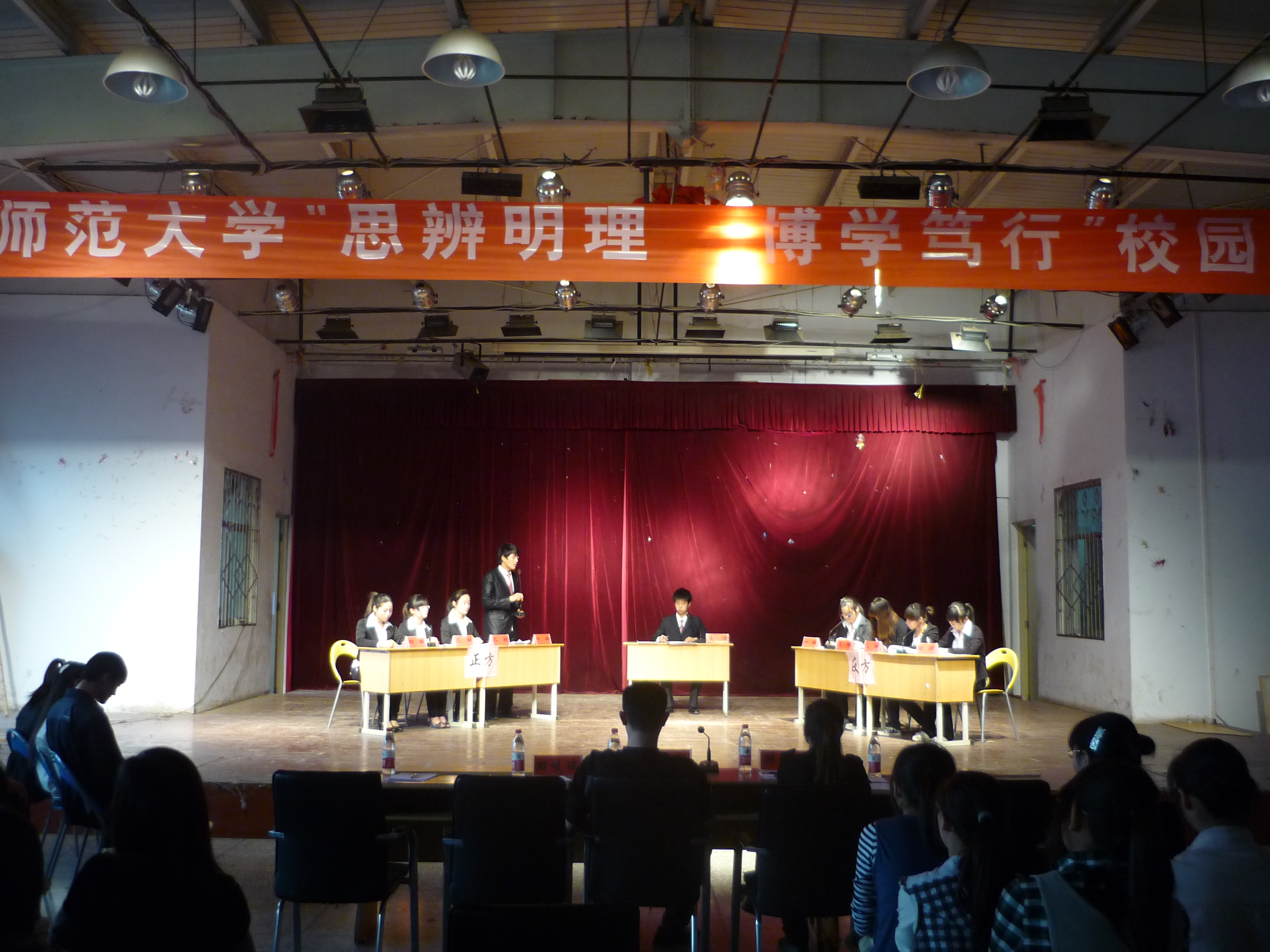 初赛中我院对战计算机与信息科学技术学院,针对“大学生就业难难在外部环境还是自身条件”进行了辩论。我院凭借统一的着装、昂扬的气势、良好的礼仪风貌在自我介绍环节就得到观众的肯定,显示出我院的专业水平。在接下来的开篇陈词、攻辩以及攻辩小结中,我院选手表现良好,流畅的语言、犀利的话语使得对方选手哑口无言。自由辩论阶段把整个赛场的气氛推向了高潮,对方选手毫不退让,针对我院的观点“大学生就业难难在外部环境”进行了全面的反驳,但是我院选手凭借敏捷的思维和逻辑,一直掌握着本场比赛的主动权,并与在场观众进行了良好的互动,赢得了评委的好评。最终,我院以89分的好成绩获得了比赛的胜利,成功晋级八强,其中我院选手李淑婷获得了本场最佳辩手的荣誉称号。