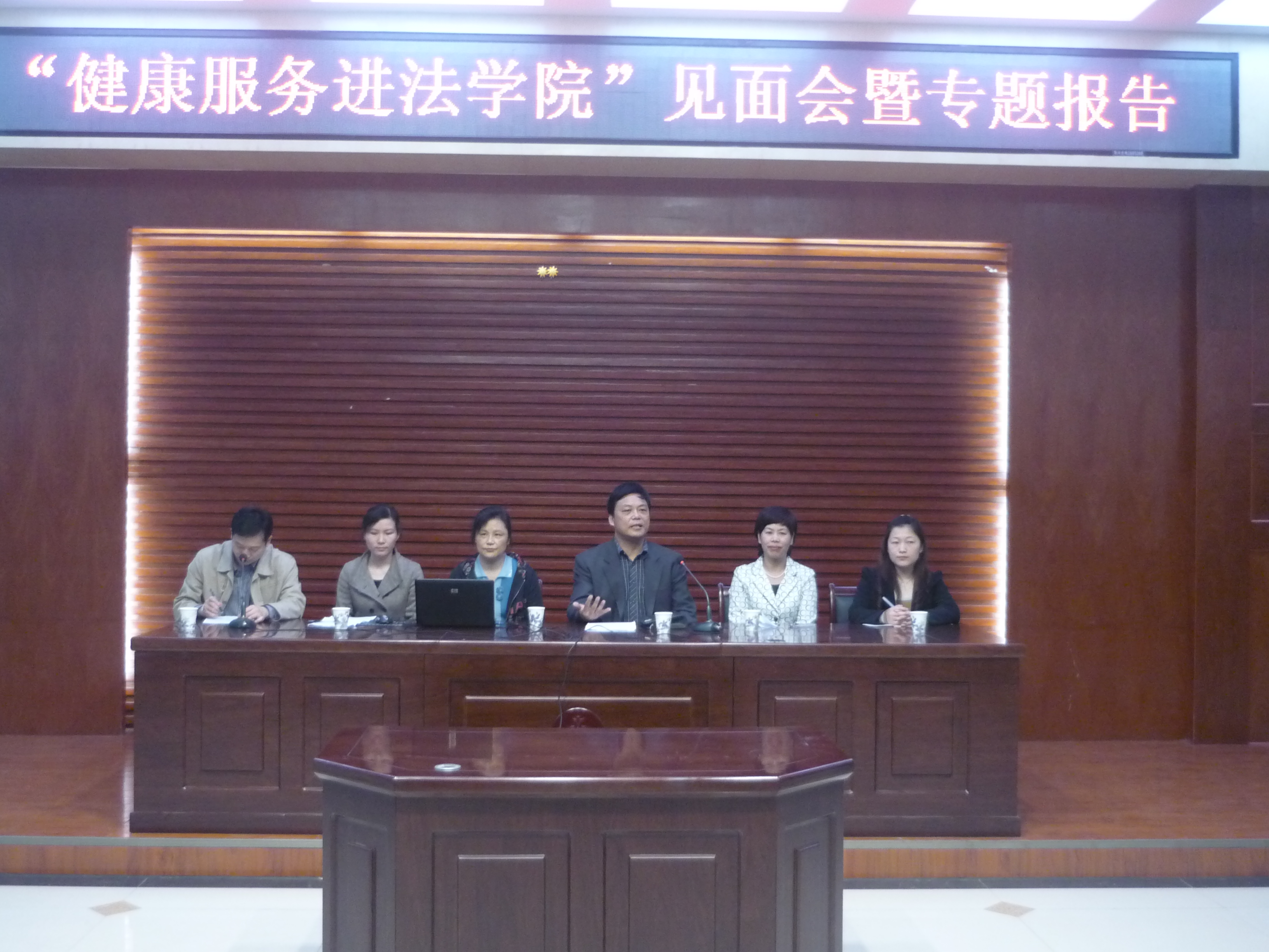首先,马协印书记对校医院的概况及本次活动的宗旨做了明确说明。他指出,校医院是真正意义上的公益性医院,把服务做到位,满足每位同学的就医需求,建立更加科学的服务模式和长效机制是校医院每位医务工作者的工作目标。接着,刘鹏淑护师就本次活动的形式及内容作了一定的说明,她指出校医院将以开展讲座、座谈会、QQ交流、微博互动等方式对大家青春期生、心理问题提供咨询和就诊服务,以满足同学们的健康需求。马书记和刘护师诚挚而温馨的话语受到在场所有学生的称赞和信任。对此,乔书记代表法学院全体师生对校医院的服务表示肯定和衷心的感谢,并对本次活动在我院的开展表示热烈欢迎。最后,余孟兰医师以PPT的形式为大家做了专题报告。余医师从功能科室、就医指南、医保简介等方面对校医院的服务概况做出了详细的讲解,并温馨提示各位同学门诊治疗和住院治疗的相关注意事项。图文并茂的讲解、细致而生动的语言赢得现场师生阵阵赞叹,全场高潮迭起,掌声此起彼伏。