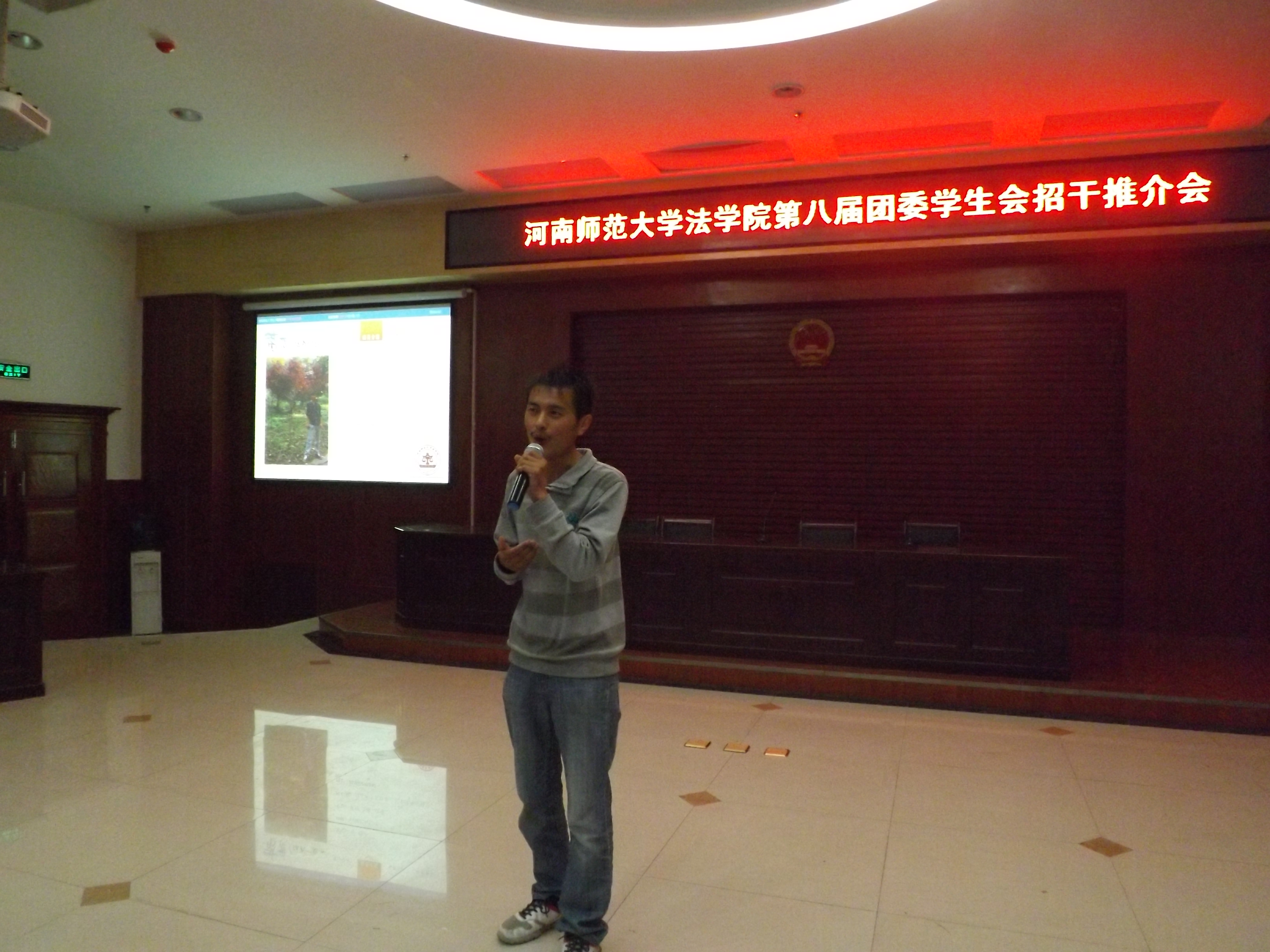 为有效吸收更多有才能的新成员,为法学院团委和学生会注入新的活力,在院团委的领导下,10月13日晚,法学院在模拟法庭召开团委和学生会招新推介会,法学院团委和学生会各部部长、副部长、社团协会会长及2012级全体学生积极参加。