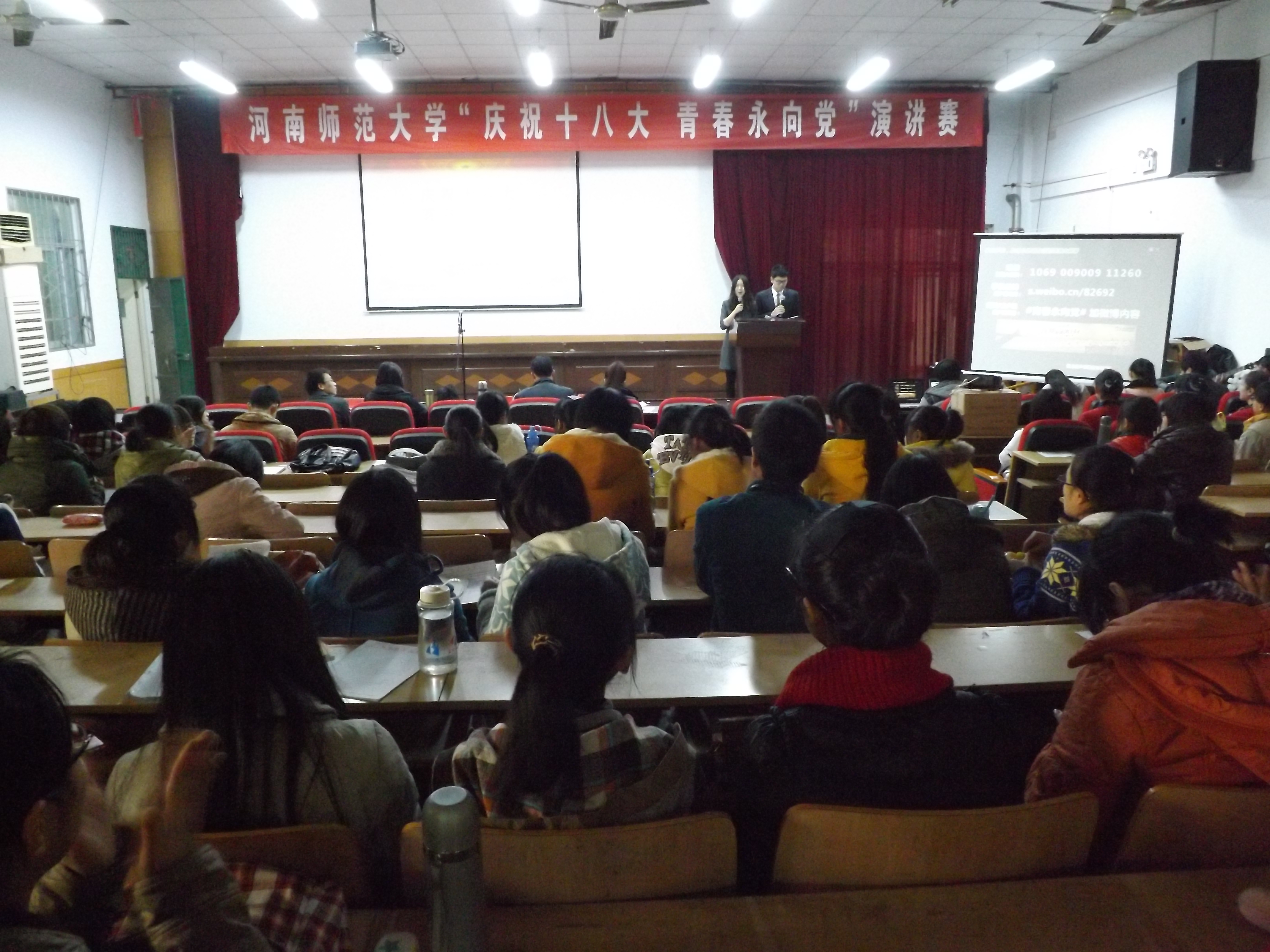 为庆祝党的十八大的顺利召开,提高同学们学习英语的积极性,给广大同学创造一个展现自我的平台,11月24日,由法学院与文学院共同承办的“庆祝十八大 青春献给党”双语演讲比赛在我校多功能报告厅隆重举行。本次比赛邀请Kristin、陈晨、陈宁、徐瑾、张军民等老师莅临活动并担任评委。校学生会主席、副主席及各院学生会主席应邀出席活动。