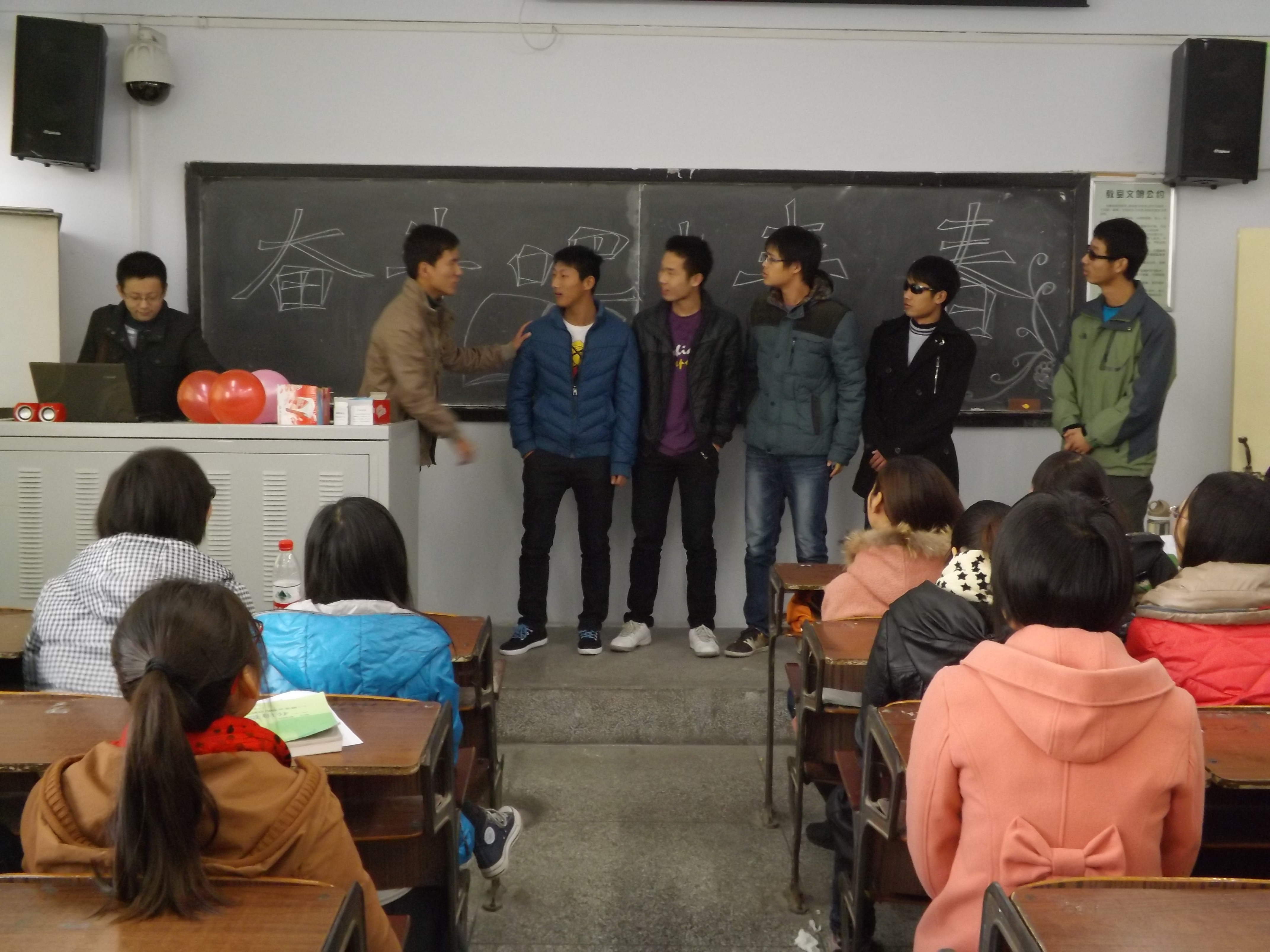 班会在男生寝室412的小品表演《疯狂粉丝团》中开始,几位男生用幽默风趣的表演赢得同学们的阵阵掌声。在“默契”环节,通过随机抽取学号的方式,让任意两位同学上台配合来完成“一个比划一个猜”游戏,在限定时间内猜出最多的获胜。极大的考验同学们的默契程度。在“团结”环节,随机将全体同学分为八组,进行“传词”游戏,用时最短的组获胜,对失败组则让组长接受做俯卧撑的惩罚。同学们了在其中,把班会推向一个新的高潮。在“自省”环节阶,民商专业副班长白瑞君、孙志强强调班级管理制度,重点说明考勤和请假制度。学习委员王晓总结前段时间同学们学习情况。最后,民商专业班长宋迪对上阶段班级情况进行总结,并阐述下阶段的工作思路,此次班会圆满成功。