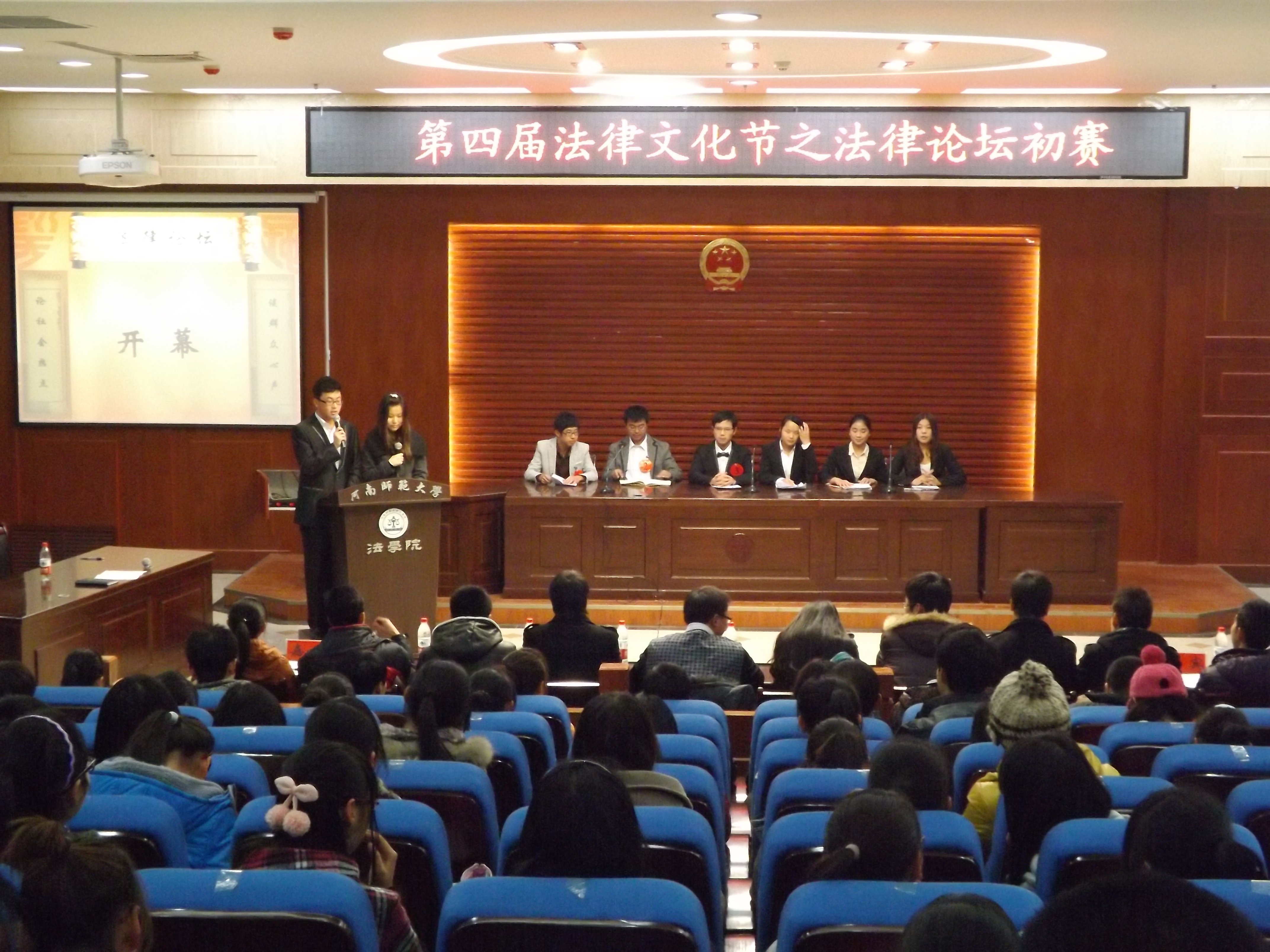 为加强校园法治文化建设,加深同学们对法律知识的理解,提高同学们的逻辑推理和语言表达能力。11月30日晚七点半,由法学院主办的法律论坛第一场初赛在东区模拟法庭顺利举行。文学院2011级辅导员高彬老师、法学院2011级辅导员左红娟老师、各参赛学院学生会主席、法学院学生会主席、大学生法律援助中心主任应邀出席了本次法律论坛。