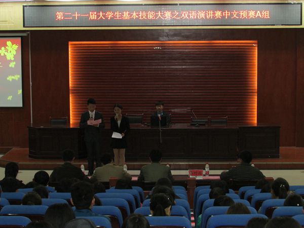 为深入贯彻落实两会精神,践行党的群众路线教育目标,拓展我校大学生的综合素质,展示新时代师大学子的青春风采。于4月26日下午2:30第二十一届大学生基本技能大赛之双语演讲赛中文预赛A组在东区法学院模拟法庭内举办。担任本次比赛的评委老师分别是校就业指导服务中心、市场信息科科长耿建泽老师,校学生处学生管理科科长张峰老师,校人事处职称科科长张利远老师,校团委办公室主任王宁老师,校党委组织部组织科科长蒋晋光老师。此外,莅临本次活动的嘉宾老师是校学生处思想教育科科长张永富老师,法学院团委书记兼2012级辅导员马淑明,各学院部分学生共同参加了这次活动。
