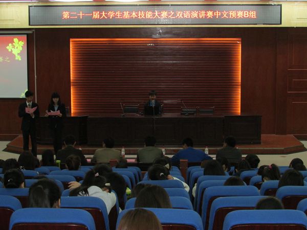 4月26日晚,第二十一届大学生基本技能大赛之汉语演讲赛B组预赛在模拟法庭举办,校就业指导服务中心市场信息科科长耿建泽、校学生处学生管理科科长张峰、校人事处职称科科长张利远、校团委办公室主任王宁、校党委组织部组织科科长蒋晋光担任本次大赛评委,校学生处思想教育科科长张永富,法学院团委书记兼2012级辅导员马淑明担任本次大赛嘉宾。此次大赛共有21位选手参赛,各学院部分学生共同参与了此次活动。