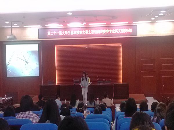 为深入贯彻落实两会精神,践行党的群众路线教育目标,拓展我校大学生的综合素质,给学生们一个展现自我的平台。4月27号上午8:30,第21届大学生基本技能大赛之双语演讲赛非专业英文预赛在模拟法庭成功开展。本次双语演讲赛特邀了外国语学院的赵攀、徐瑾、陈宁宁、孙静、杨密五位老师担任评委;校学生处思想教育科科长张永富,法学院团委书记、2012级辅导员马淑明,2013级辅导员康东书出席本次会议嘉宾。各学院部分学生共同参加了这次活动。
