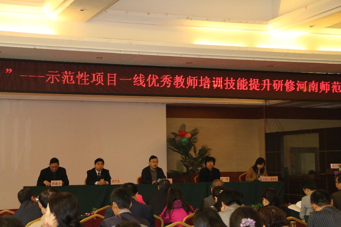 10月24日,“国培计划(2015)”示范性项目一线优秀教师培训技能提升研修河南师范大学班开班典礼在佛力得假日酒店举行。河南师范大学副校长李雪山、法学院院长黄进才、继续教育学院院长武军会、外国语学院书记宋霞、继续教育学院副院长石磊、法学院副院长华锋和参加“国培计划”的法学院、外国语学院的学员们参加了开班典礼。开班典礼由继续教育学院副院长聂君涛主持。