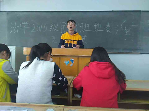 经过了半年的接触,学生之间都有了更深的了解。为了进一步提高班委工作水平,选出同学们最满意的班委,法学院2015级民商班于3月29日在田家炳312室举行了班委竞选仪式,2015级兼职辅导员姚文明及民商班全体同学参加了此次竞选仪式。