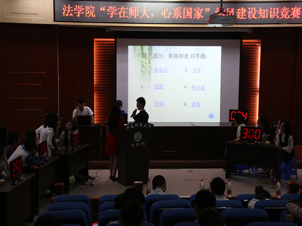 为让广大学生把学校学风建设的主旨精神和各项要求内化于心,外化于行,5月29日上午,法学院于模拟法庭举办了“学在师大,心系国家”学风建设系列活动之知识抢答赛。法学院主要负责同志和各年级辅导员担任比赛评委,法学院各年级学生参加比赛。