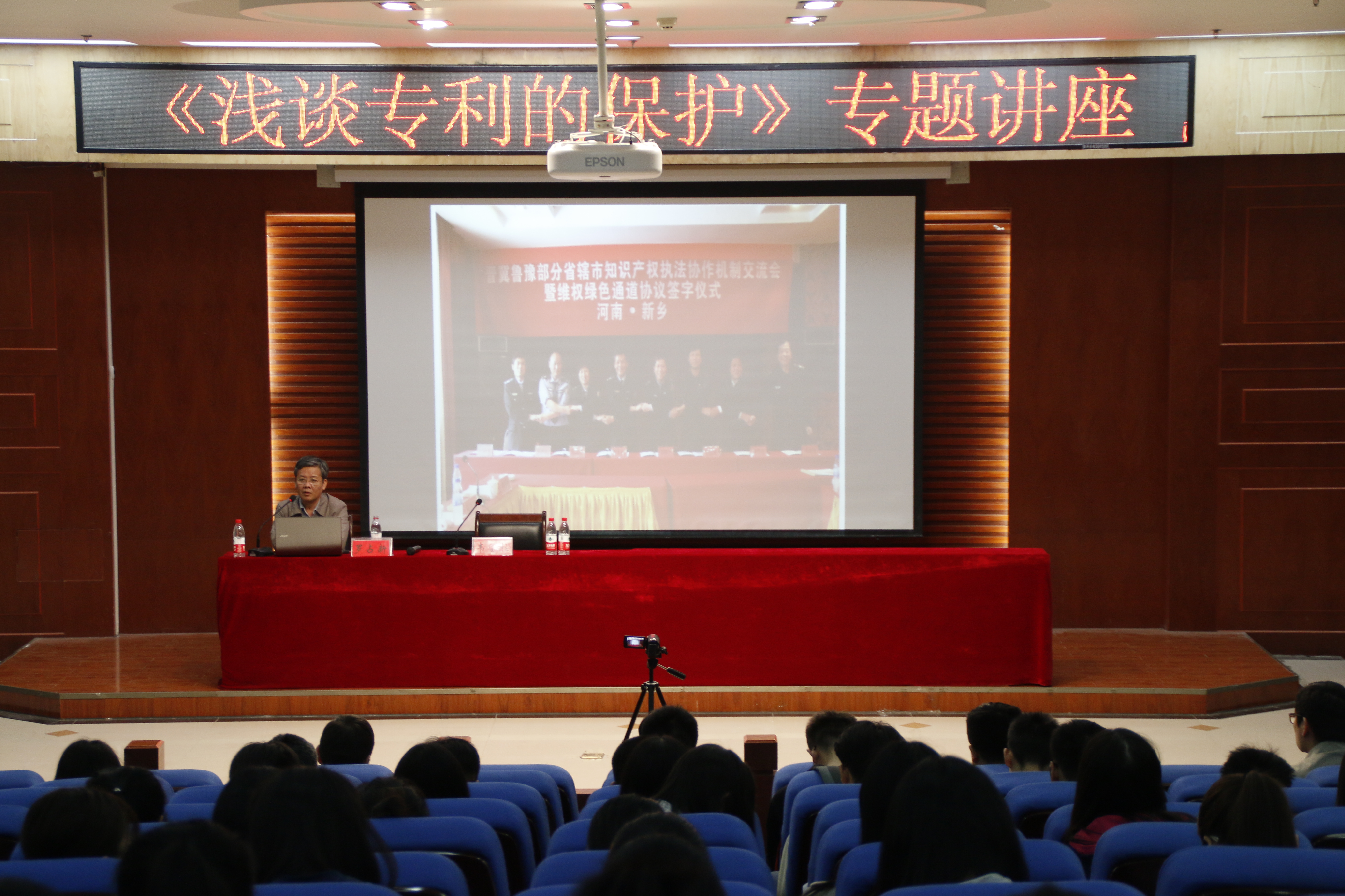 创新创造改变生活,知识产权竞争未来。在世界知识产权周活动到来之际,4月21日,我院特邀新乡市科技局党组成员、知识产权局局长罗占新教授到我校模拟法庭讲授《浅谈知识产权的保护》专题讲座。法学院部分教师,研究生和本科生聆听了此次讲座。我院副院长韦留柱主持此次讲座。