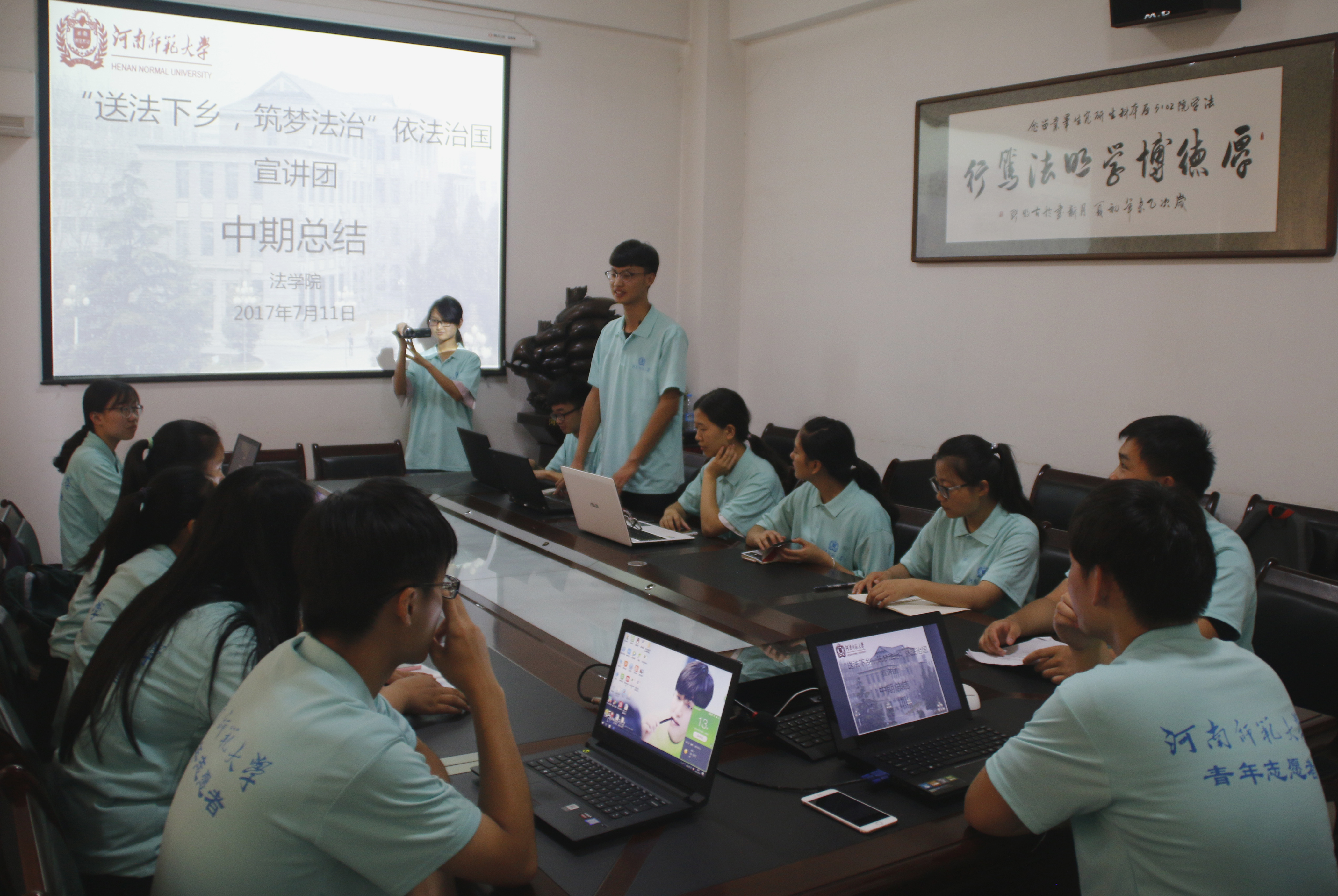 7月10日,河南师范大学“送法下乡,筑梦法治”依法治国宣讲团在崇法楼302室进行中期总结汇报。会议由“送法下乡,筑梦法治”依法治国宣讲团队长黄世龙主持,法学院团委书记、2016级辅导员马淑明及全体队员参加。
